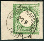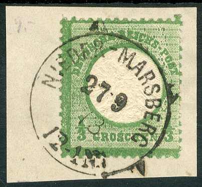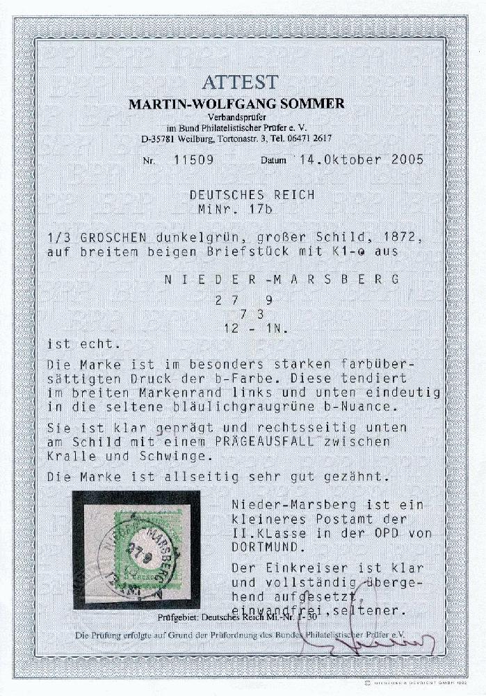 | Zusatzinformationen und Suchstichworte: | 119. Veuskens Auktion 12. Januar 2023 Los 1264 Deutsches Reich, 1872 Grosser Brustschild 1/3 Gr. Großer Schild 1872, in b.-Farbe, auf Briefstück mit K1. 'Nieder-Marsberg 27.9.1873', die Marke zeigt sich in besonders starkem, farbübersättigtem Druck der b.-Farbe und weist unten am Schild einen Prägeausfall zwischen Kralle und Schwinge auf. Nieder-Marsberg ist ein kl. Postamt der zweiten Klasse in der OPD-Dortmund, ausführl. Farbfotoattest Sommer BPP. Selten! Zuschlag 80,00 EUR |
