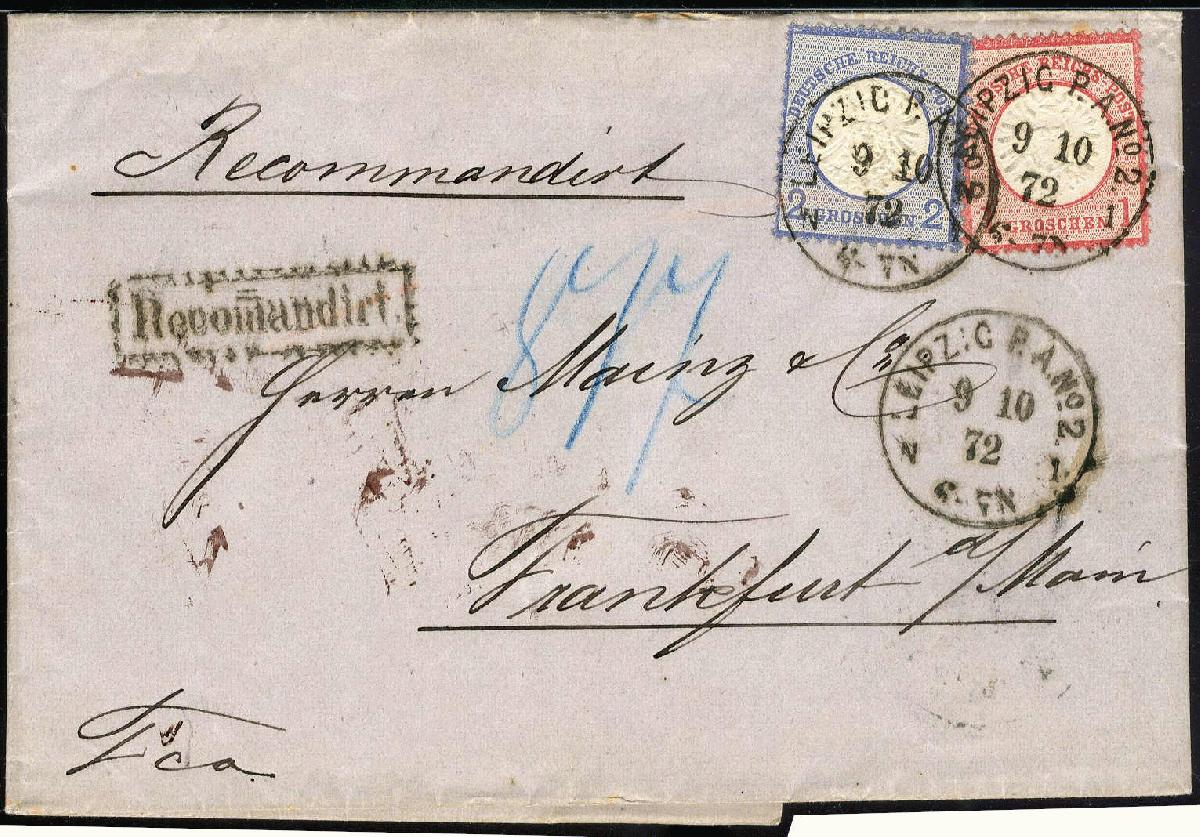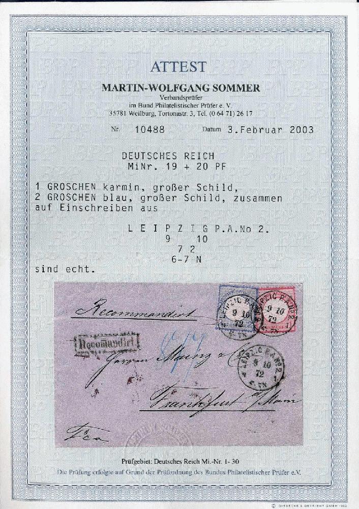 | Zusatzinformationen und Suchstichworte: | 119. Veuskens Auktion 12. Januar 2023 Los 1270 Deutsches Reich, 1872 Grosser Brustschild 1 Gr. und 2 Gr. Großer Schild 1872, Mi.-Nr. 20. mit Abart XII. 'gebrochenes C in Reichs', auf R.-Brief von Leipzig 19.10.1872 nach Frankfurt/Main. Hervorragend geprägt und in einwandfreier Zentrierung und in sehr guter Zähnung, ausführl. Farbfotoattest Sommer BPP 'Der Plattenfehler ist auf Brief selten!'. Zuschlag 60,00 EUR |