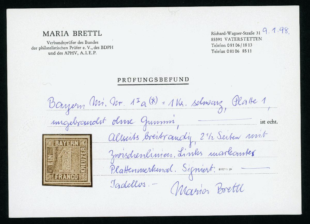 | Zusatzinformationen und Suchstichworte: | Klüttermann - 5. Auktion 26. Januar - 3. Februar 2023 Los 254 Altdeutschland Bayern 1 Kr. schwarz Pl. 1, breitrandiges ungebr. Luxusstück ohne Gummi mit 2 1/2 Schnittlinien, links markantes Plattenmerkmal, FB Brettl Zuschlag 520,00 EUR |