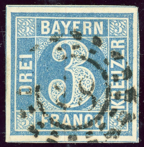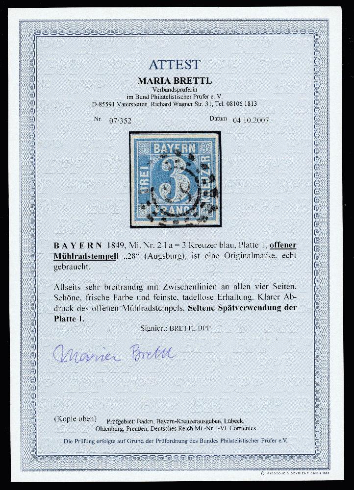 | Zusatzinformationen und Suchstichworte: | Klüttermann - 5. Auktion 26. Januar - 3. Februar 2023 Los 284 Altdeutschland Bayern 3 Kr. blau Pl. I, breitrandiges Luxusstück mit Zwischenlinien an allen 4 Seiten und seltener Entwertung durch oMR 28 Augsburg, seltene Spätverwendung der Platte 1, FA Brettl Zuschlag 490,00 EUR |
