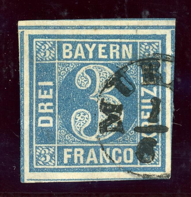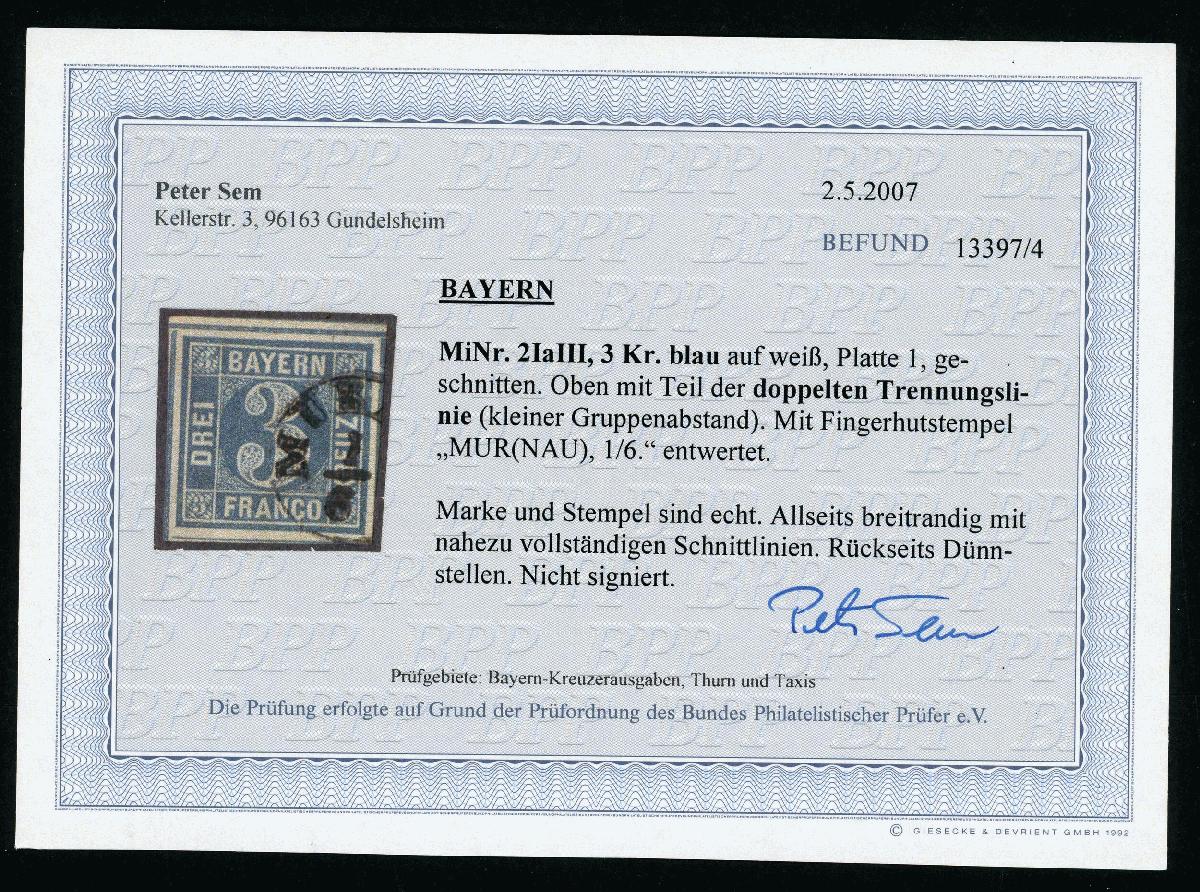 | Zusatzinformationen und Suchstichworte: | Klüttermann - 5. Auktion 26. Januar - 3. Februar 2023 Los 301 Altdeutschland Bayern 3 Kr. blau Pl. I, sehr breitrandig mit oben doppelter Trennungslinie und seltenem Fingerhut-K1 MURNAU, leichte Dünnstellen, aber mit diesem Stempel sehr seltene Marke, FB Sem Ausruf 150,00 EUR |