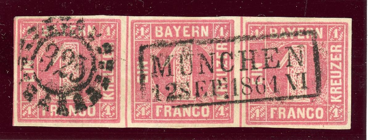 | Zusatzinformationen und Suchstichworte: | Klüttermann - 5. Auktion 26. Januar - 3. Februar 2023 Los 344 Altdeutschland Bayern 1 Kr. dunkelrosa, waagerechter breitrandiger Luxus Dreierstreifen mit toller Duplexentwertung durch oMR 325 und Ra2 MÜNCHEN/12 SEP. 1861, Liebhaberstück mit FN Sem Zuschlag 360,00 EUR |