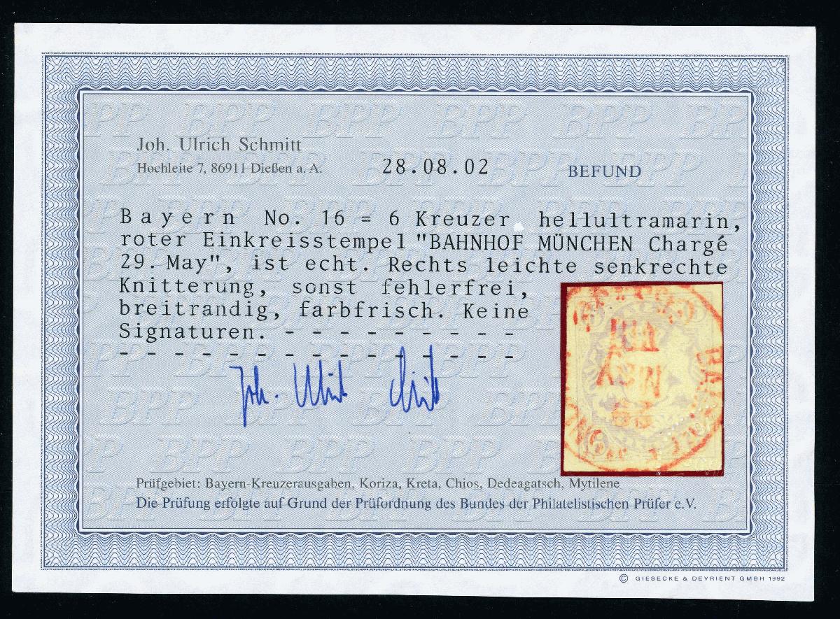 | Zusatzinformationen und Suchstichworte: | Klüttermann - 5. Auktion 26. Januar - 3. Februar 2023 Los 496 Altdeutschland Bayern 6 Kr. blau, allseits breitrandig mit zentrischem roten K1 BAHNHOF MÜNCHEN Charge, bis auf kleine Knitterung einwandfrei, FB Schmitt Zuschlag 90,00 EUR |