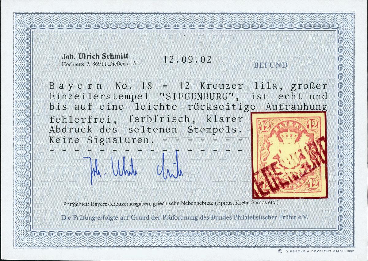 | Zusatzinformationen und Suchstichworte: | Klüttermann - 5. Auktion 26. Januar - 3. Februar 2023 Los 504 Altdeutschland Bayern 12 Kr. lila, breitrd. mit seltener Entwertung durch Aushilfs-L1 SIEGENBURG, rs. minim. Aufrauhung, FB Schmitt Ausruf 100,00 EUR |