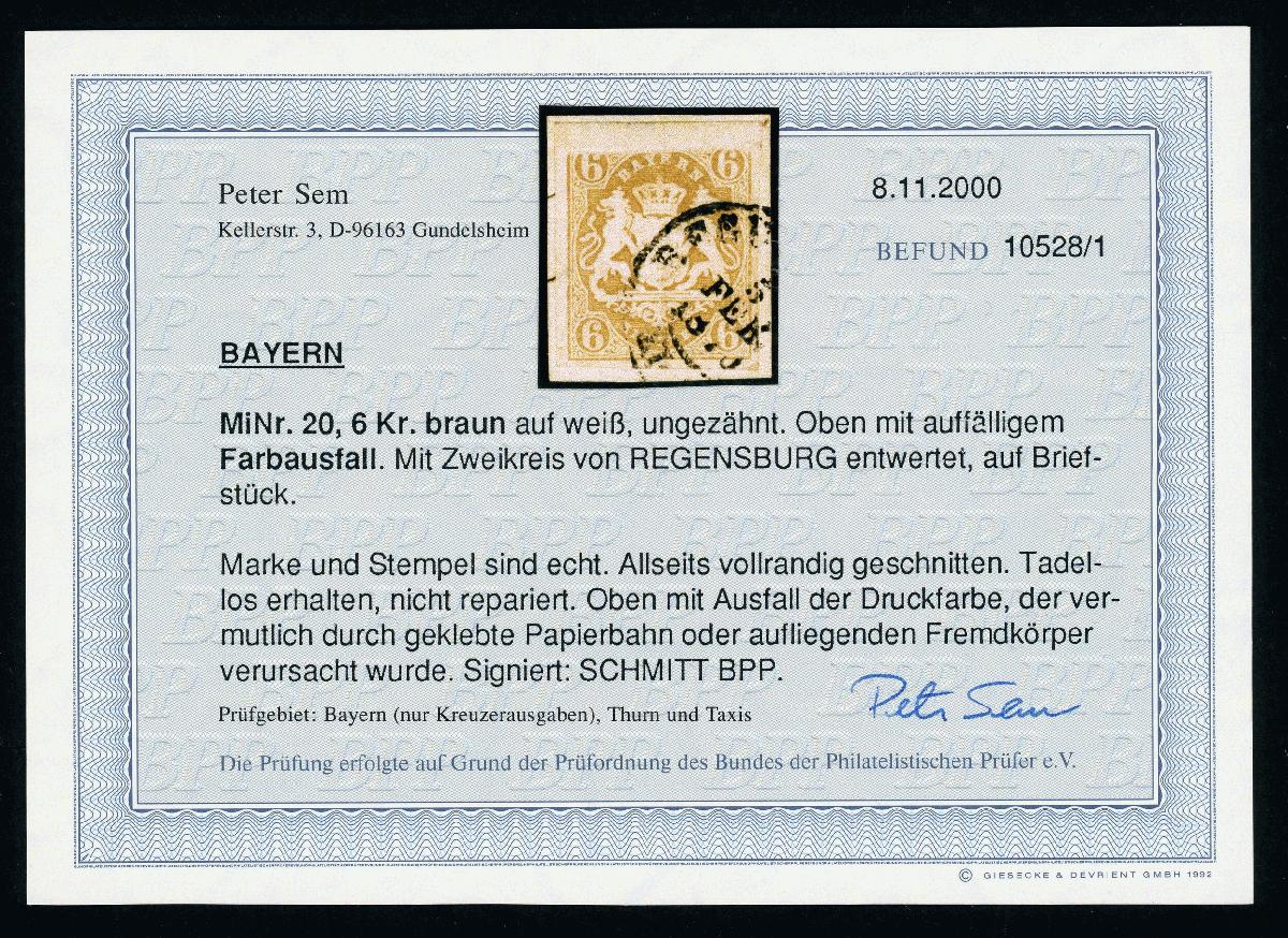 | Zusatzinformationen und Suchstichworte: | Klüttermann - 5. Auktion 26. Januar - 3. Februar 2023 Los 522 Altdeutschland Bayern 6 Kr. braun, breitrandiges Luxusstück mit sehr seltener Abart "oben über die volle Seite mit Druckausfall", vermutlich durch geklebte Papierbahn oder Fremdkörper beim Drucken verursacht, sauberer K2 REGENSBURG, Liebhaberstück mit FB Sem Ausruf 500,00 EUR |