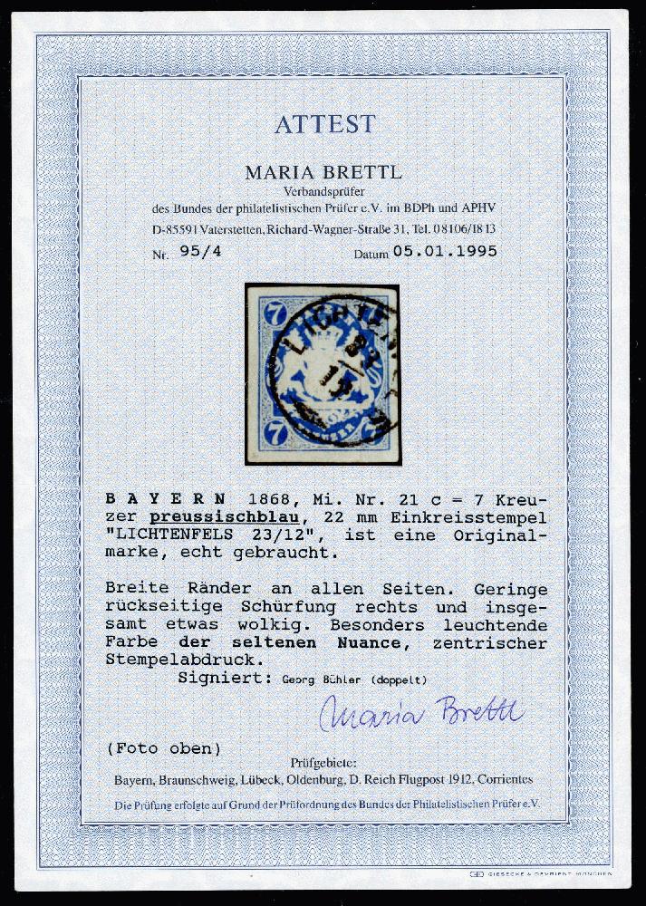| Zusatzinformationen und Suchstichworte: | Klüttermann - 5. Auktion 26. Januar - 3. Februar 2023 Los 526 Altdeutschland Bayern 7 Kr. preußischblau, sehr farbfrisch und sehr breitrandig mit zentr. Zier-K1 LICHTENFELS, geringe Schürfung rechts hinten und Papier etwas wolkig, optisch eine sehr schöne Marke mit FA Brettl Katalogwert: 1000 Ausruf 250,00 EUR |