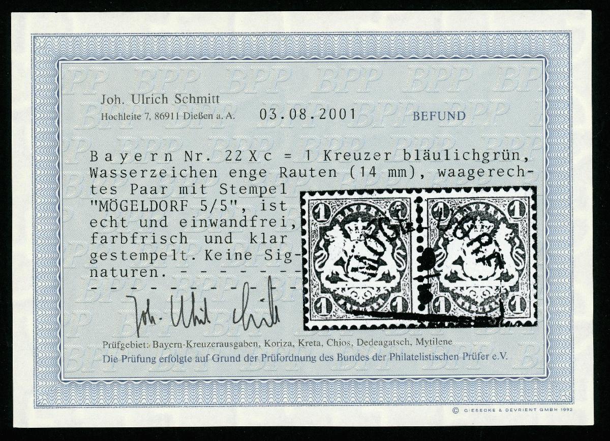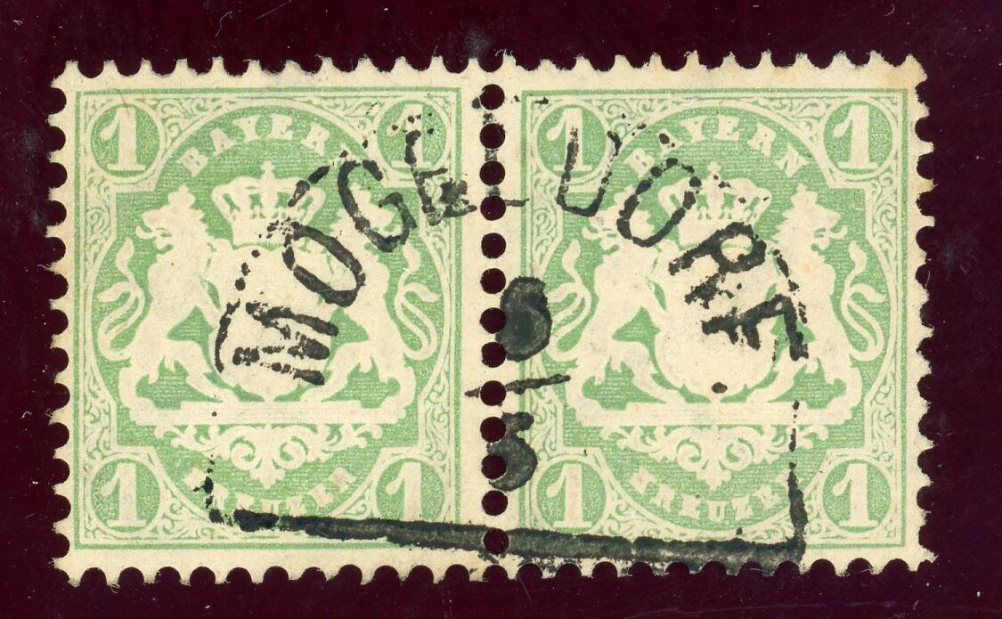 | Zusatzinformationen und Suchstichworte: | Klüttermann - 5. Auktion 26. Januar - 3. Februar 2023 Los 535 Altdeutschland Bayern 1 Kr. dunkelgrün im waager. Luxuspaar mit idealem HK MÖGELDORF, FB Schmitt Ausruf 150,00 EUR |