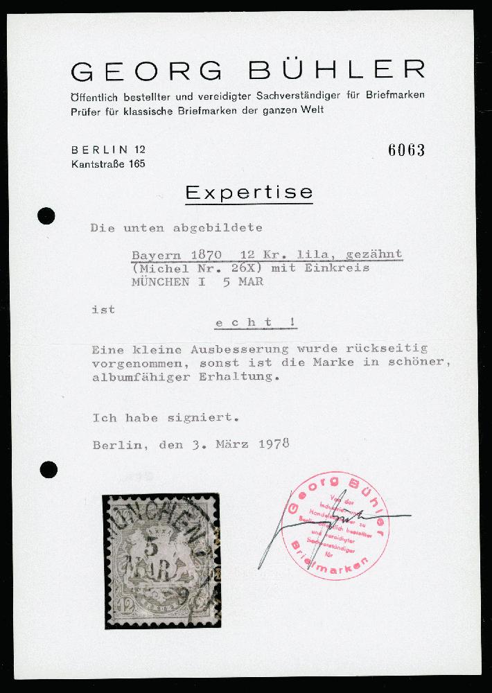 | Zusatzinformationen und Suchstichworte: | Klüttermann - 5. Auktion 26. Januar - 3. Februar 2023 Los 553 Altdeutschland Bayern 12 Kr. lila Wz. X, farbtiefes Stück mit zentr. K1 MÜNCHEN in tadelloser Zähnung, rücks. kleine Papierausbesserung sonst tadellos, Fa. Bühler Katalogwert: 1400 Ausruf 300,00 EUR |