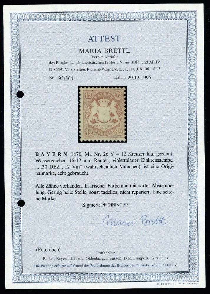 | Zusatzinformationen und Suchstichworte: | Klüttermann - 5. Auktion 26. Januar - 3. Februar 2023 Los 556 Altdeutschland Bayern 12 Kr. lila mit seltenem Wz. Y und zartem violettblauen K1, unmerkl. kleine helle Stelle, tiefst sign. Pfenninger und FA Brettl, ein schönes Stück der seltenen Marke Katalogwert: 6000 Ausruf 1.200,00 EUR |
