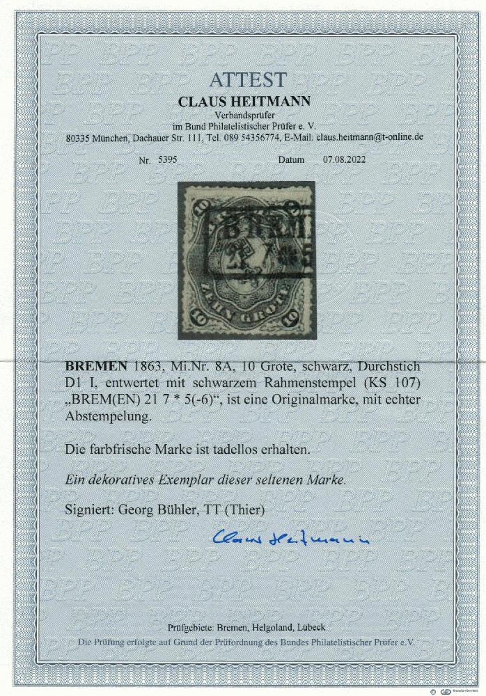 | Zusatzinformationen und Suchstichworte: | Dr. Derichs 171. Auktion 18. - 20. August 2023 Los 8211 Altdeutschland Bremen 10 Gr. schwarz, Durchstich "A", Luxusstück mit klar und gerade aufgesetztem Ra2 "Bremen 21/7" (Knauer-Salm 107). Wie alle Bremen-Marken eine in einwandfreier und auch so aktuell BPP-attestierter Qualität am Markt praktisch nicht vorhandene Marke. Neues Fotoattest Heitmann BPP: "Die farbfrische Marke ist tadellos erhalten.". (Mi. 1.200.- + Pluszeichen , wobei ein Katalogwert für ein Stück dieser Qualitätsklasse ohne Bedeutung ist.) Ausruf 1.000,00 EUR |