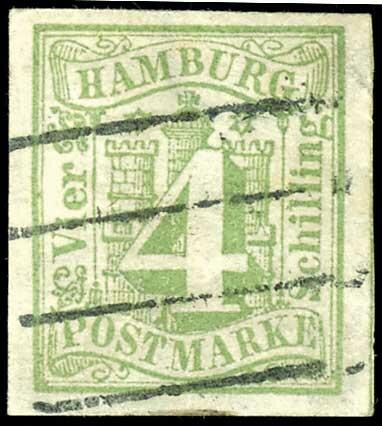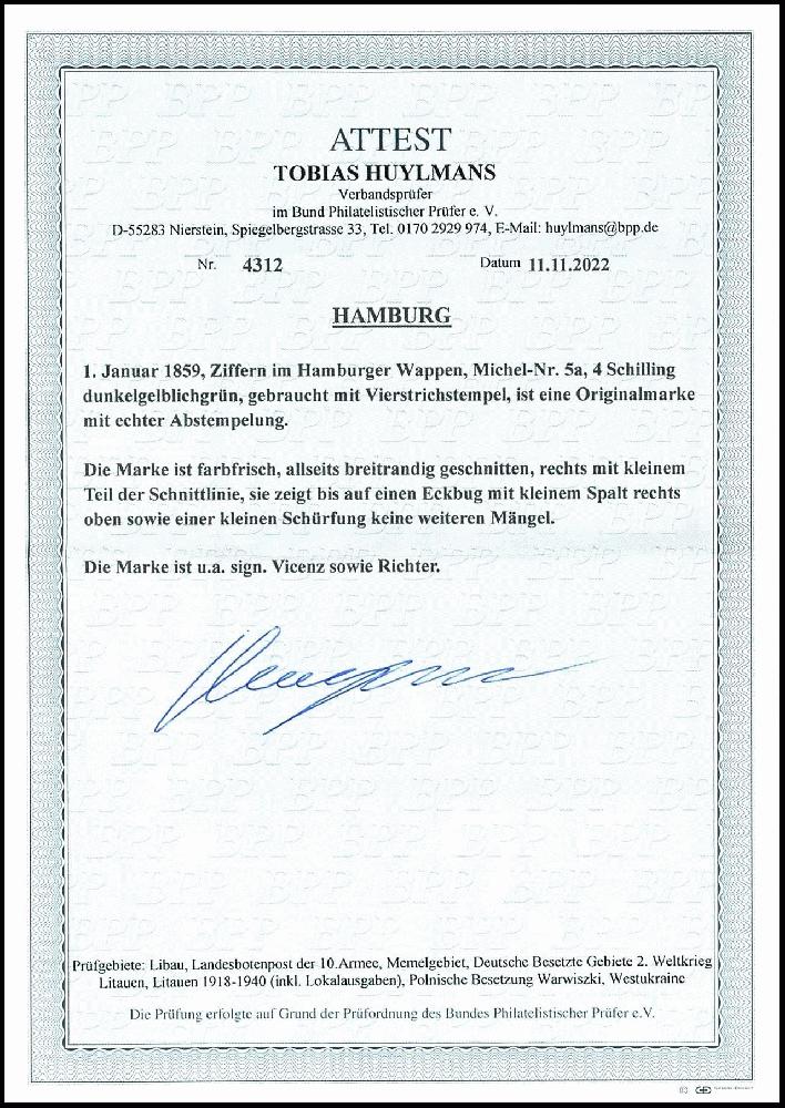 | Zusatzinformationen und Suchstichworte: | Dr. Reinhard Fischer 190. Auktion 27. - 28. Januar 2023 Los 389 Altdeutschland Hamburg 4 Sch. dunkelgelblichgrün, allseits breitrandig und farbfrisch, gestempelt, Eckbug mit kleinem Spalt sowie kleine Schürfung, ansonsten tadellos und optisch ansprechend, u.a. sign. Richter, Fotoattest Huylmans BPP, Mi. 1.500.- Ausruf 150,00 EUR |