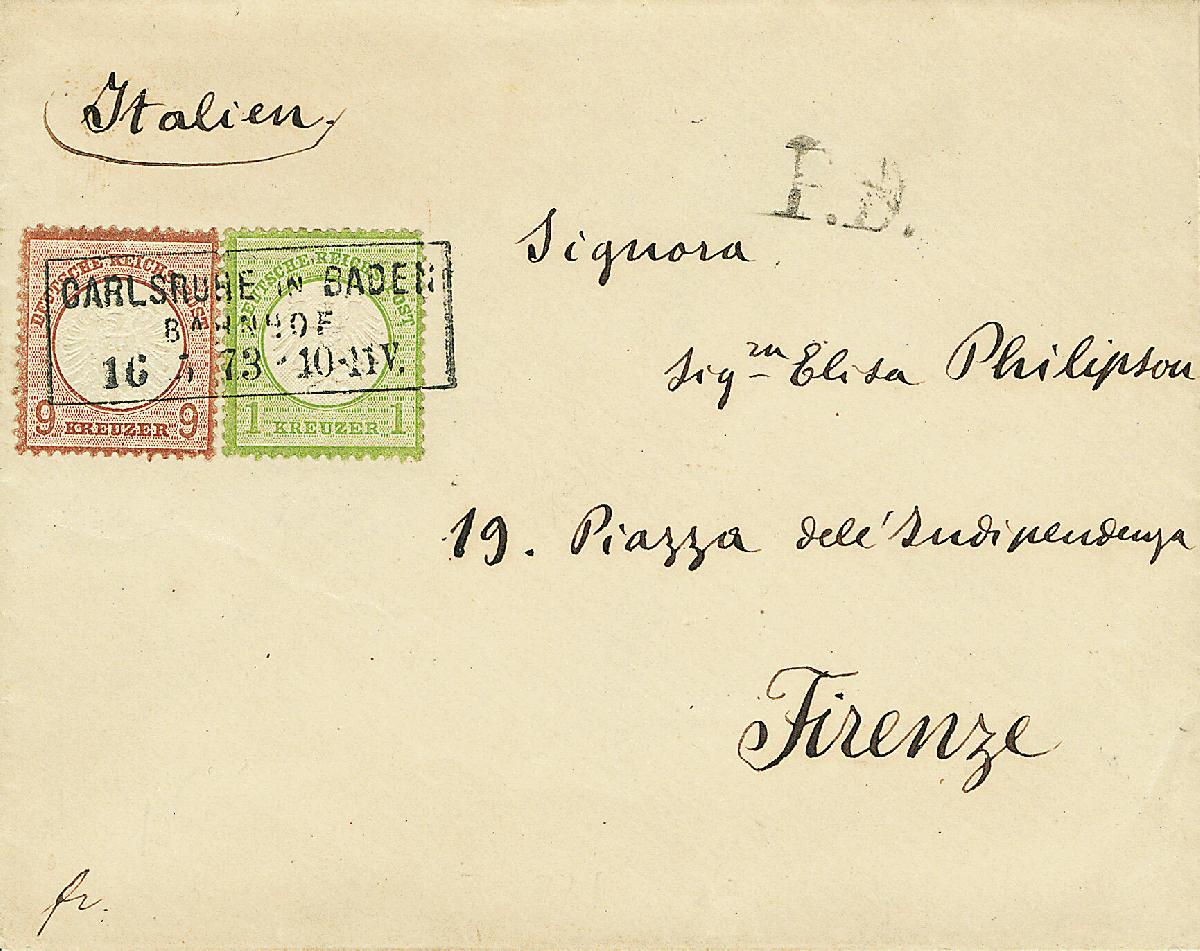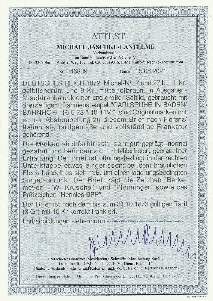 | Zusatzinformationen und Suchstichworte: | Dr. Derichs 171. Auktion 18. - 20. August 2023 Los 9169 Deutsches Kaiserreich, 1872 Große Schildausgabe 9 Kr. lilabraun "Großer Schild", gute "b" Farbe, in Mischfrankatur mit 1 Kr. grün "Kleiner Schild auf Auslandsbrief mit klarem Ra3 "Carlsruhe in Baden Bahnhof 16.5.73" und mit nebengesetztem "P.D." nach Florenz/Italien. Luxus. Ein seltener und qualitativ herausragender Brief aus der bekannten "Philipson" Korrespondenz. Attest Hennies BPP und Fotoattest Jäschke-Lantelme BPP: "in fehlerfreier, gebrauchter Erhaltung". (Mi. 1.200.- + Pluszeichen) Ausruf 500,00 EUR |
