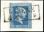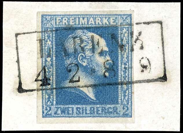 | Zusatzinformationen und Suchstichworte: | Dr. Reinhard Fischer 190. Auktion 27. - 28. Januar 2023 Los 572 Altdeutschland Preussen M2 Sgr. blau, glatter Grund, dünnes durchscheinendes Papier, vollrandiges und farbfrisches Luxusstück, klar gestempelt mit seltenem Ra2 "Labenz 4 2 * 8-9" auf Briefstück, gepr. Drahn und Fotobefund Brettl AIEP (2013): "in feiner, tadelloser Erhaltung. Ursprünglicher Zustand." Ausruf 200,00 EUR |