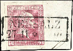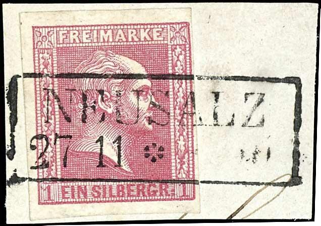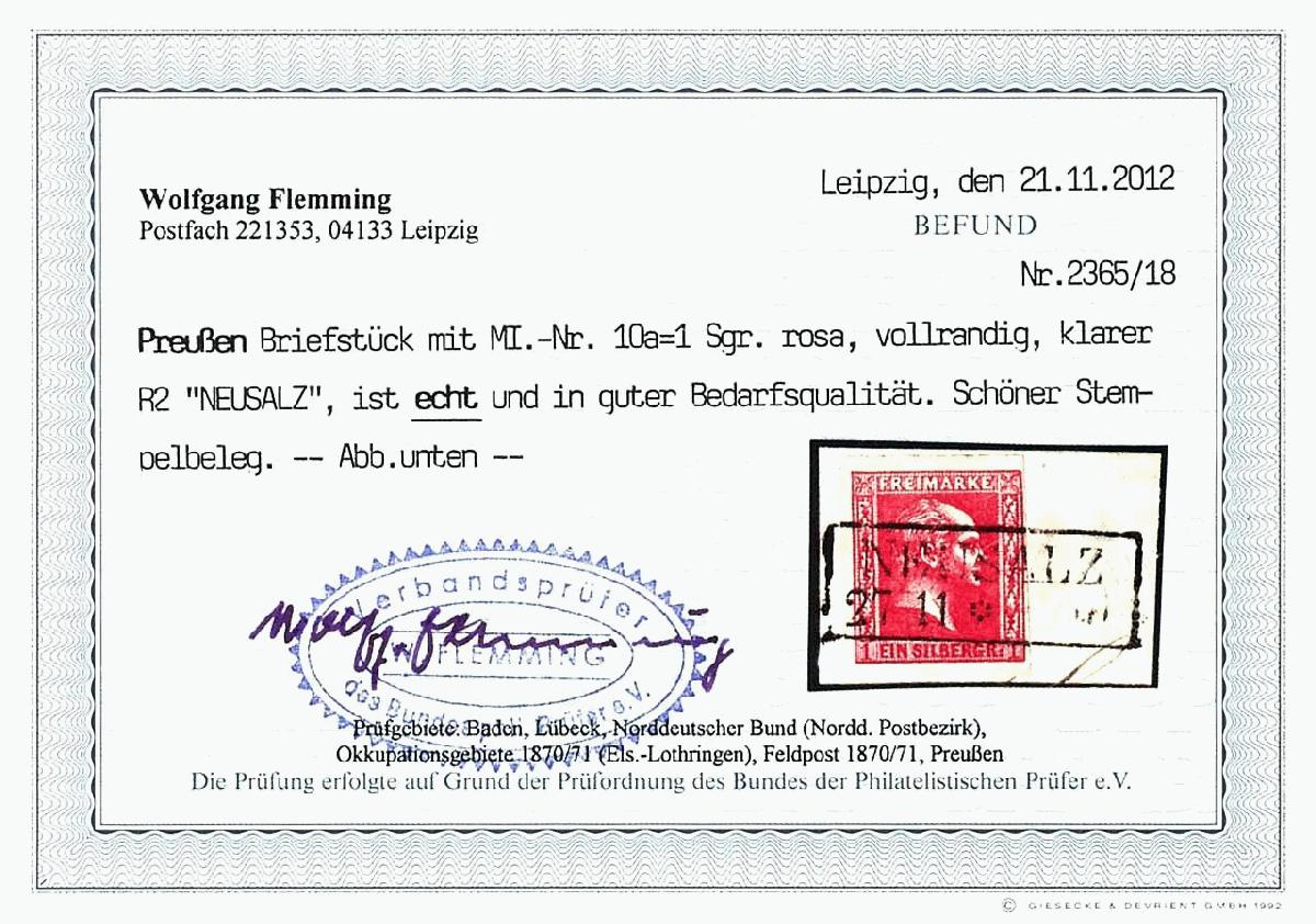 | Zusatzinformationen und Suchstichworte: | Dr. Reinhard Fischer 190. Auktion 27. - 28. Januar 2023 Los 581 Altdeutschland Preussen 1 Sgr. rosa, gegitterter Grund, allseits vollrandiges und farbfrisches Kabinettstück, klar gestempelt mit Ra2 "NEUSALZ 27 11" (Reg.-Bez. Liegnitz) auf Briefstück, Fotobefund Flemming BPP (2012): "Schöner Stempelbeleg." Ausruf 40,00 EUR |