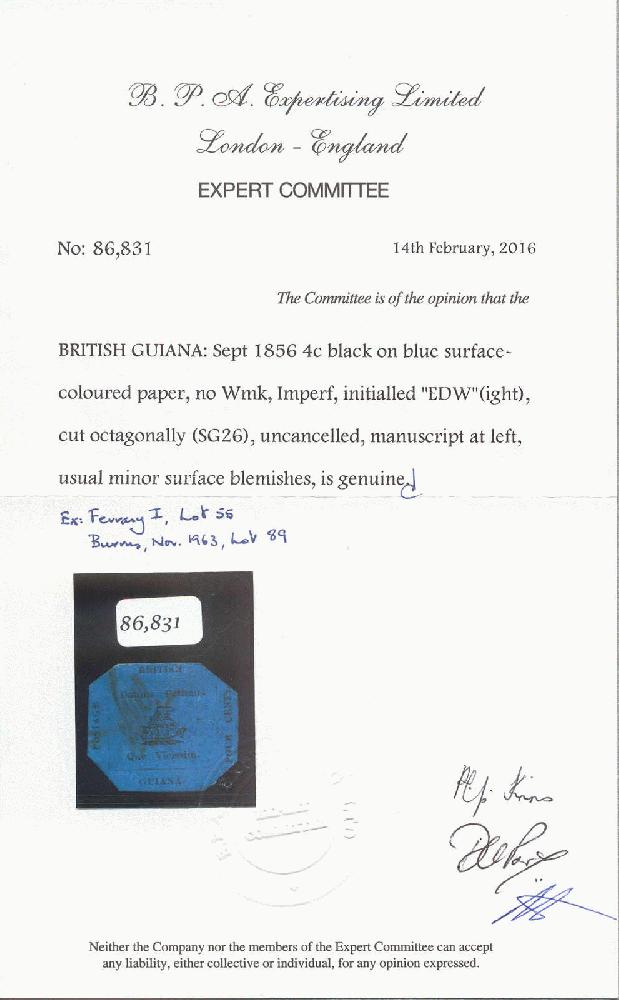 | Zusatzinformationen und Suchstichworte: | 16. classicphil GmbH Auktion 3. März 2023 Los 1587 Britisch Guayana 1856,4 c. schwarz auf blauem, oberflächengefärbtem Papier, ohne Wasserzeichen, ungezähnt, paraphiert EDW (ight), achteckiger Schnitt, mit guten Rändern, nicht entwertet, die glasierte Oberfläche ist in perfektem Zustand für dieses Papier, dieses Stück muss als von außergewöhnlicher Qualität angesehen werden und als eines der schönsten Bekannten, unter Berücksichtigung der gebrauchten Exemplare von denen eines auf Brief existiert/drei viereckige Ausschnitte und 6 achteckige Ausschnitte, eine herausragende Weltrarität - das einzige ungebrauchte Exemplar, eine der zwei seltensten und wertvollste von allen ungebrauchten Marken von Britisch Guyana, ein absolutes Juwel und Rarität höchsten Grades im Britischen Imperium, diese Briefmarke war irrtümlich als gebraucht gelistet in den drei vorherigen Verkäufen, erstmals von der BPA 2016 als ungestempelt geprüft und 2021 von der RPSL als nicht gestempelt bestätigt, das erwähnte gefüllte Loch von dem BPA behauptet, dass es aufgrund der primitiven Papierherstellung natürlich entstanden sei nur der Ordnung halber erwähnt, sie können keine bessere finden laut Adrian Myer von BPA ist es nicht von Bedeutung, man kann es nennen den kleinen Bruder der 1 c./magenta/die teuerste Briefmarke der Welt die aus der gleichen Ausgabe stammt und das höchste Potenzial für Investoren hat, ex Ferrary I/Los 55/Juni 1921// Burrus, Nov 1863/Los 89 vom Robson Lowe Veräusserung// Edward M. Gilbert/Los 288, H. R. Harmer, Juni 2005// John E. Du Pont, Tatiana Sammlung/Los 40051/Juni 2016, Prüfungsbefund BPA (2016) und RPSL (2021), Kabinett! Schätzpreis 900,000 EUR Ausruf 120.000,00 EUR |