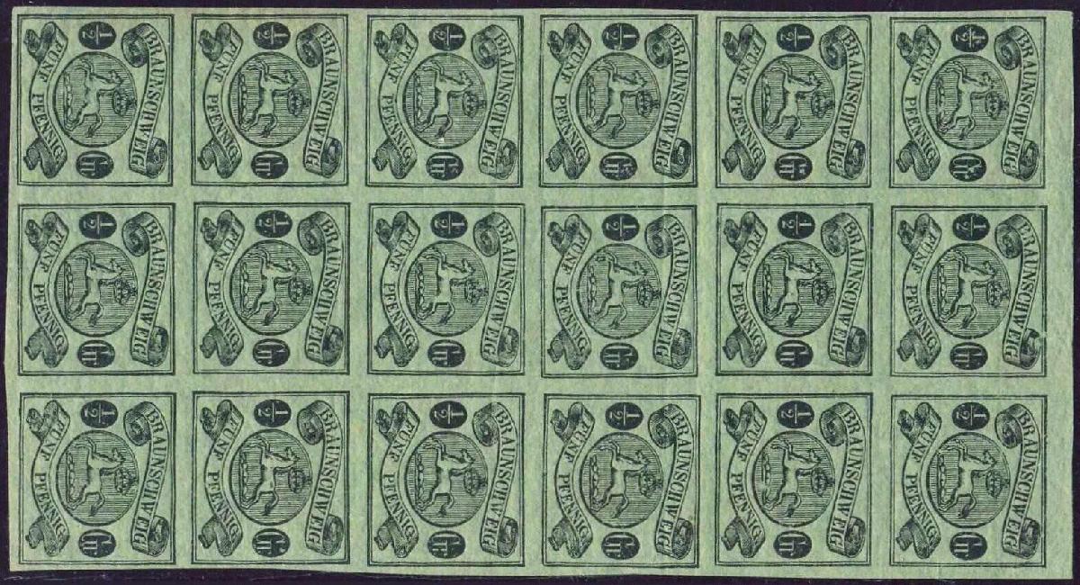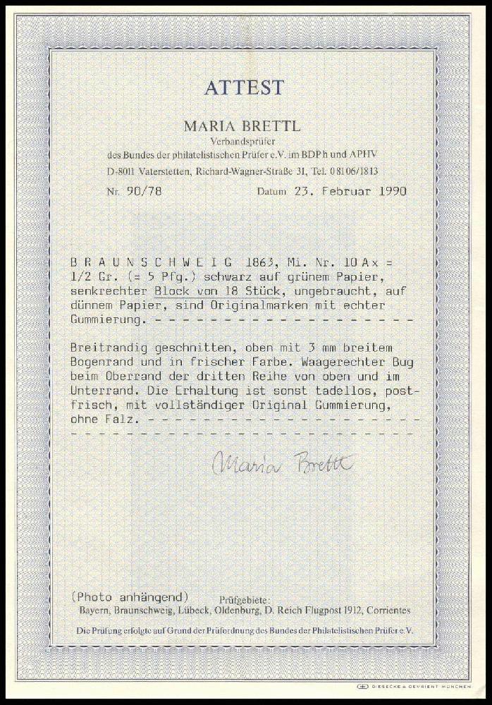 | Zusatzinformationen und Suchstichworte: | Auktionshaus Weiser - 773. Auktion 10. - 11. Februar 2023 Los 1007 Altdeutschland Braunschweig Braunschweig 1861/63, 1/2 Gr. (5 Pfg.) schwarz a. lebhaftgraugrün, dünnes Papier, im senkrechten 18er-Block, Vortrennbug im Oberrand und außerhalb der 3. Markenreihe, breitrandig, absolut postfrisch, Pracht, der Michel-Wert der Einzelmarken beträgt bereits EUR 1.800,--, als Einheit in dünnen Papier erheblich höher zu bewerten, Foto-Attest Brettl BPP (postfr./Mi.-Nr.10 Ax/Mi.-Wert LP) (5) (De113) Ausruf 350,00 EUR |
