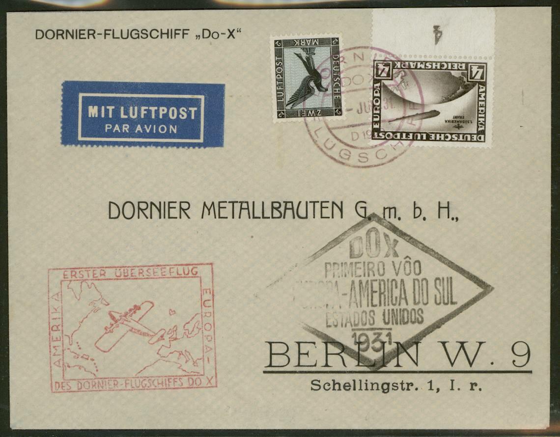 | Zusatzinformationen und Suchstichworte: | Ulrich Felzmann 177. Auktion 8. - 11. März 2023 Los 1560 Deutsches Reich, 1923/32 Weimarer Republik 4 RM Südamerikafahrt mit stehendem Wasserzeichen, mit tarifrichtiger Beifrankatur 2 RM Adler auf besonders attraktivem, oben minimal verkürztem Do-X Flugbrief, mit klarem Bordpoststempel 8.6.31 und allen Stempeln in tadelloser Prachterhaltung, sign. Aisslinger BPP sowie Fotoattest H.-D. Schlegel BPP "... einwandfrei" Ausruf 150,00 EUR |