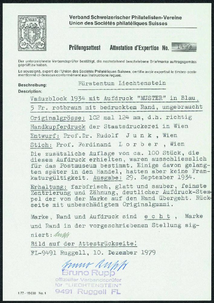| Zusatzinformationen und Suchstichworte: | Gert Müller 117. Auktion 23. Februar 2023 Los 2321 Liechtenstein DER MUSTER-BLOCK: Vaduz-Block 1934, farbfrisch in voller Originalgröße mit seltenem blauem Handstempel "MUSTER", farbfrisch und in voller Originalgröße, tadellos postfr. Dieser Muster-Block hatte nur eine Auflage von circa 100 Stück, die für das Postmuseum bestimmt waren. Einige Exemplare hiervon gelangten später in den Handel. Eine große Liechtenstein-Seltenheit in erstklassiger Qualität. Luxus! Attest Rupp Ausruf 1.500,00 EUR |