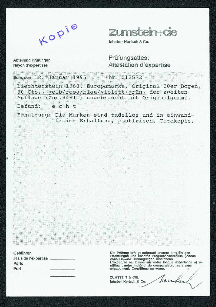 | Zusatzinformationen und Suchstichworte: | Gert Müller 117. Auktion 23. Februar 2023 Los 2377 Liechtenstein 50 Rp. Europa 1960, die sehr seltene Type II, farbfrisch und sehr gut gezähnt mit breitem linkem Zier-Bogenrand, ungefaltet, tadellos postfr., ohne jegliche Signaturen. Luxus! Attestkopie für ehemaligen Kleinbogen Zumstein. Mi. 1700,- €++ Ausruf 500,00 EUR |
