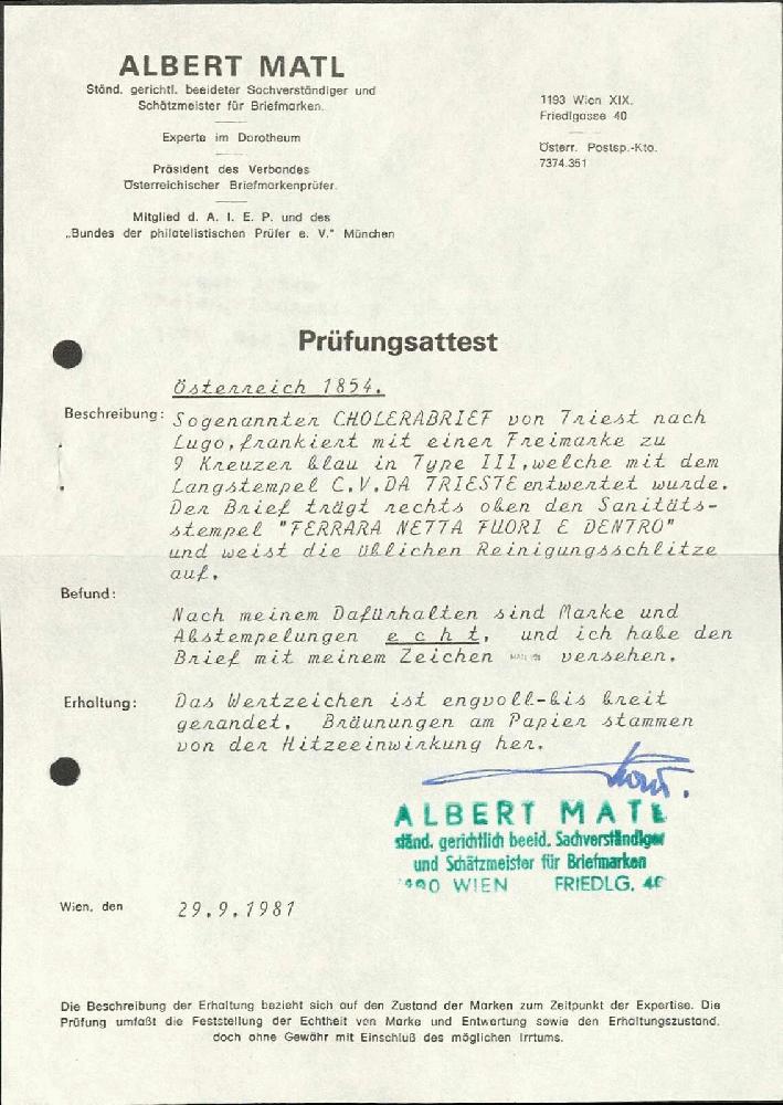 | Zusatzinformationen und Suchstichworte: | Gert Müller 117. Auktion 23. Februar 2023 Los 2419 Österreich 9 Kr. blau, Maschinenpapier, Type III, farbfrisch und allseits voll- bis breitrandig (rechts oben gebrochene Randlinie) auf dekorativem Cholerabrief mit Einzeiler "C.V.DA TRIESTE" und Räucherschlitzen, sowie dem seltenen Sanitätsstempel "FERRARA NETTA FUORI E DENTRO" nach Lugo mit Transit- und Ankunftsstempeln, innen datiert "TRIEST 11. NOVEMBER. 54". Ein sehr attraktiver Cholerabrief der ersten Ausgabe von Österreich! Attest Matl Ausruf 1.000,00 EUR |