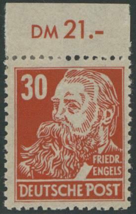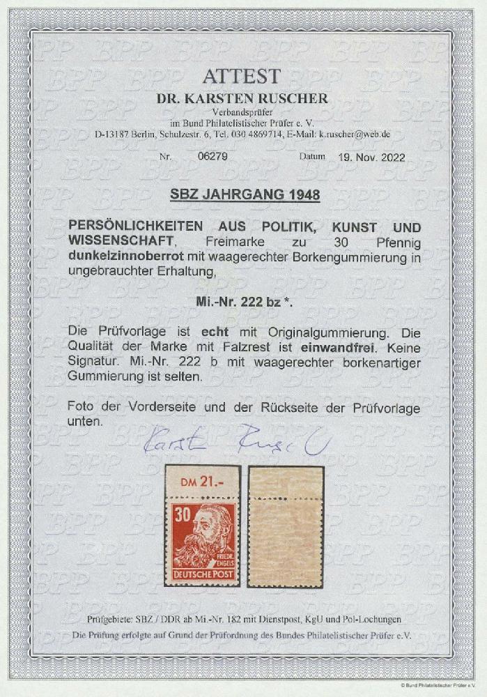 | Zusatzinformationen und Suchstichworte: | Ulrich Felzmann 177. Auktion 8. - 11. März 2023 Los 2225 Sowjetische Zone 30 Pfg Engels dunkelzinnoberrot mit ganzflächig waagerechter Borkengummierung, ungebrauchtes Oberrandstück (!) in tadelloser, unsignierter Prachterhaltung, Fotoattest Ruscher BPP "... einwandfrei ... selten" Ausruf 150,00 EUR |