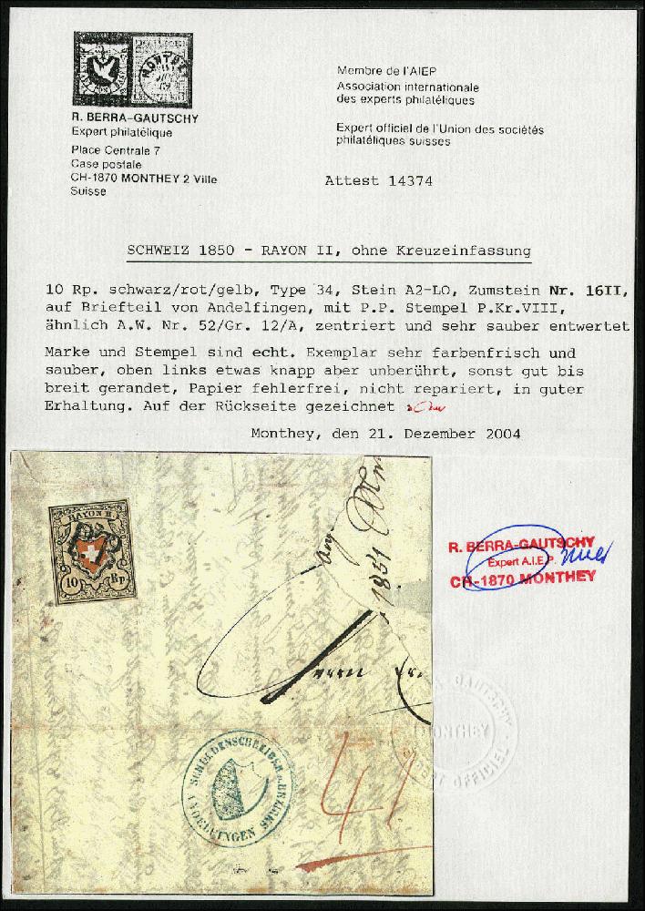 | Zusatzinformationen und Suchstichworte: | 71. Rölli Auktion 11. Februar 2023 Los 466 Rayon II, gelb, ohne Kreuzeinfassung (STEIN A 2) Rayons II, gelb, Stein A2 T.34 A2/LO, P.P. feinst auf knapp/vollrandiger Marke, Briefteil nach Winterthur. Attest Berra 2004 Ausruf 180,00 CHF |