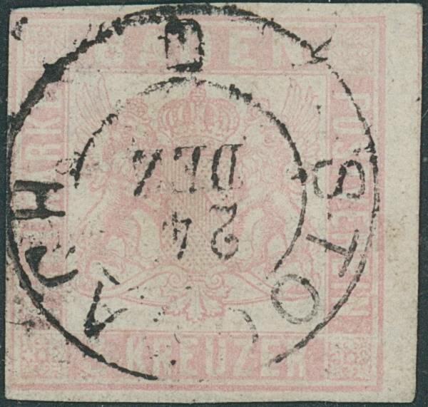 | Zusatzinformationen und Suchstichworte: | Ulrich Felzmann 177. Auktion 8. - 11. März 2023 Los 1365 Altdeutschland Baden Stockach-Provisorium 3 Kr rosa ungezähnt in typischer blassrosa Farbgebung, ringsum voll- bis weit überrandig (!) mit Randlinienteil der rechten Nebenmarke, rückseitig zwei kleine, angesichts der Seltenheit vernachlässigbare Auffaserungen, darüber hinaus fehlerfrei in ursprünglicher Liebhaberqualität! Dies gilt insbesondere unter Berücksichtigung der Tatsache, dass der wunderschön aufsitzende, ideal zentrisch, klar und kopfstehend platzierte K2 STOCKACH 24 DEZ das früheste bekannte Verwendungsdatum dieser bedeutenden Altdeutschland-Rarität darstellt! Mehrfach attestiert Pfenninger, Englert sowie zuletzt Stegmüller BPP "Große und wirkungsvolle Baden-Rarität", € 50.000,- Ausruf 18.000,00 EUR |
