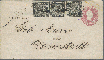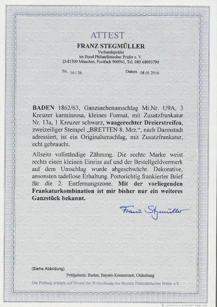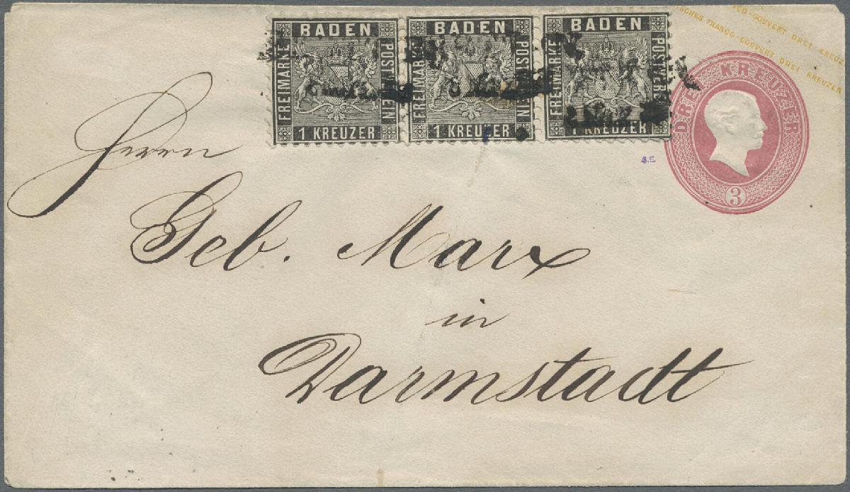 | Zusatzinformationen und Suchstichworte: | Christoph Gärtner 55. Auktion 20. - 24. Februar 2023 Los 5005 D Altdeutschland Baden 1863, Ganzsachenumschlag 3 Kreuzer karminrosa, kleines Format, mit Zusatzfrankatur Wappen, 1 Kreuzer schwarz, gez. K 10 als WAAGERECHTER DREIERSTREIFEN auf Brief aus Bretten nach Darmstadt. Der mit Zweizeiler "BRETTEN / 8 Mrz" entwertete Dreierstreifen ist allseits vollständig gezähnt und farbfrisch. Laut Fotoattest Stegmüller BPP (2016) weist die rechte Marke rechts einen kleinen Einriss auf, der Bestellgeldvermerk auf dem Umschlag wurde abgeschwächt, ansonsten dekorative, tadellose Erhaltung. Dem Prüfer war mit der vorliegenden Frankaturkombination bisher nur ein weiteres Ganzstück bekannt! Ausruf 1.000,00 EUR |
