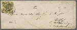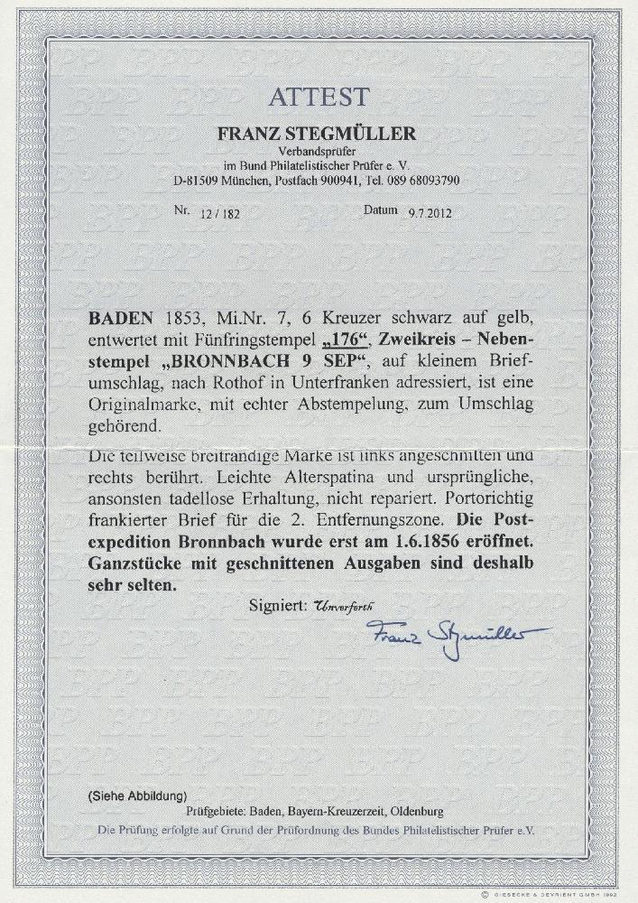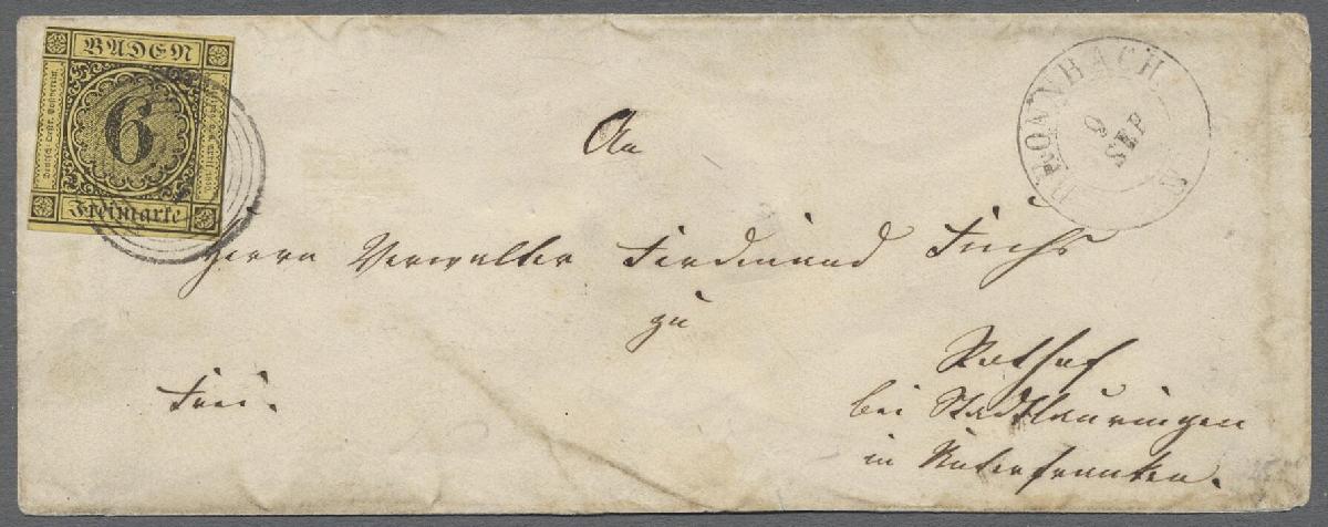 | Zusatzinformationen und Suchstichworte: | Christoph Gärtner 55. Auktion 20. - 24. Februar 2023 Los 5008 D Altdeutschland Baden "176" (BRONNBACH), Ziffernzeichnung, 6 Kreuzer schwarz auf gelb, entwertet mit Fünfringstempel "176", nebengesetzt Datumstempel "BRONNBACH / 9 SEP" auf kleinem Umschlag nach Rothof / Unterfranken. Die Postexpedition Bronnbach wurde am 1.6.1856 eröffnet, daher sind Marken und Belege mit der Ziffernausgabe sehr selten! Marke zwischen berührt und breitrandig, Brief trägt Altersspuren, aber laut Fotoattest Stegmüller (2012) "ansonsten tadellose Erhaltung". Außerdem geprüft [Max] Unverfehrt Ausruf 2.500,00 EUR |