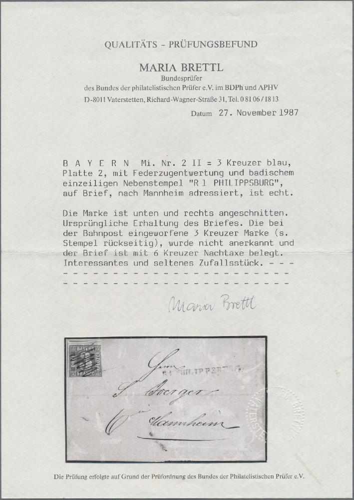 | Zusatzinformationen und Suchstichworte: | Christoph Gärtner 55. Auktion 20. - 24. Februar 2023 Los 5016 D Altdeutschland Bayern 1851, 3 Kr. blau, Platte 2, farbfrisches Exemplar, oben mit Teil der Nachbarmarke, unten und rechts angeschnitten, auf Briefhülle von Philippsburg (Großherzogtum Baden) nach Mannheim, mit Inhalt datiert 3.Juni 1851, vorderseitig mit nebengesetztem L1 "R1 PHILIPPSBURG". Der Brief wurde bei der badischen Bahnpost aufgegeben, dort nicht anerkannt und die Marke mit Federzug entwertet, rs. Transit- und Ankunftsstempel 4.6.51. Prüfungsbefund Maria Brettl (1987) "Interessantes und seltenes Zufallsstück." Ausruf 500,00 EUR |