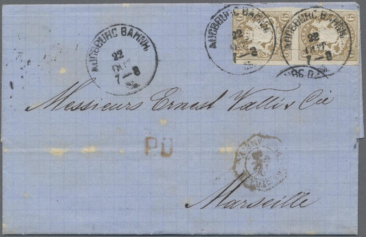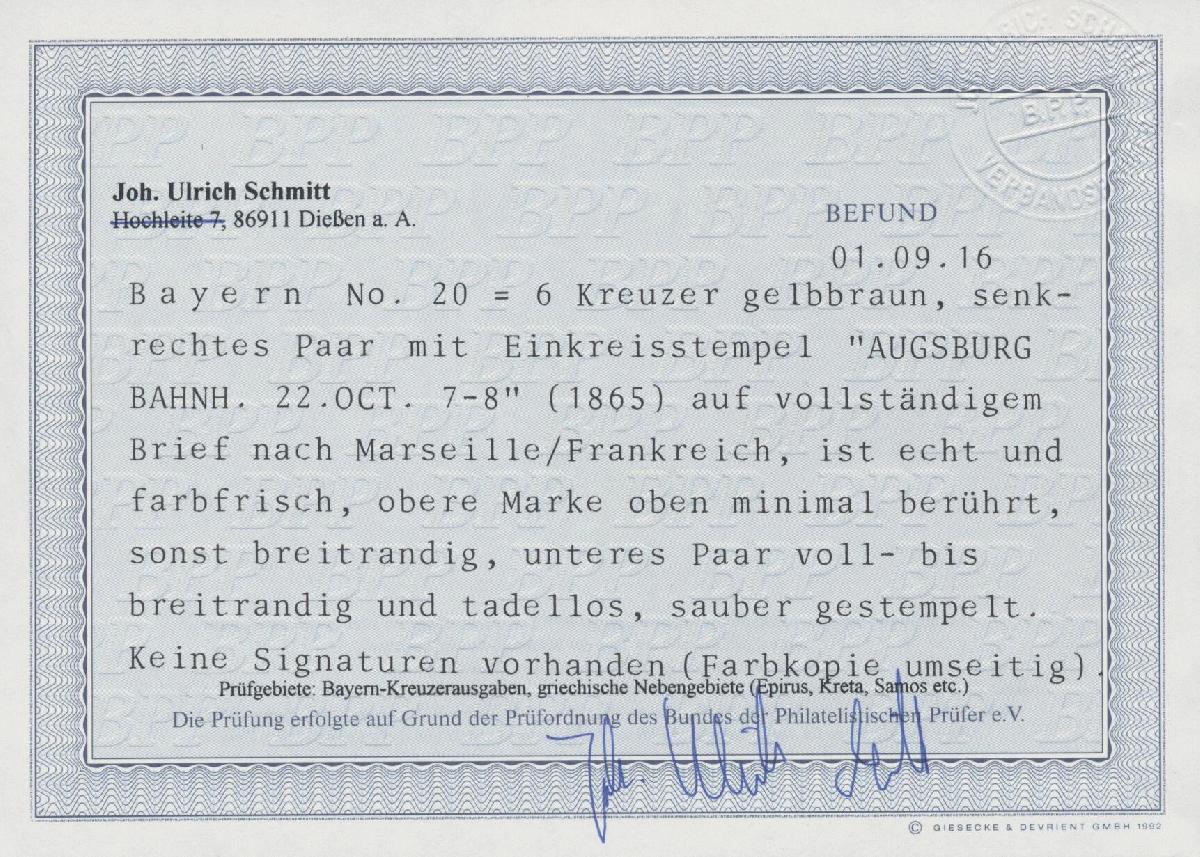 | Zusatzinformationen und Suchstichworte: | Christoph Gärtner 55. Auktion 20. - 24. Februar 2023 Los 5026 D Altdeutschland Bayern 1868, 6 Kr. ockerbraun, senkrechtes Paar, unten teils gering berührt, sonst vollrandig, auf bläulichem Brief mit Inhalt (1868), K 1 AUGSBURG BAHNH. nach Marseille, nicht häufige Mehrfach-Frankatur auf Auslandsbrief, Foto-Befund Schmitt (2016), Mi 800,- Zuschlag 130,00 EUR |