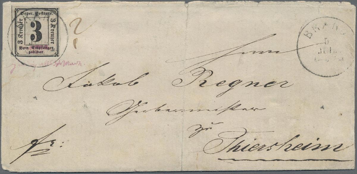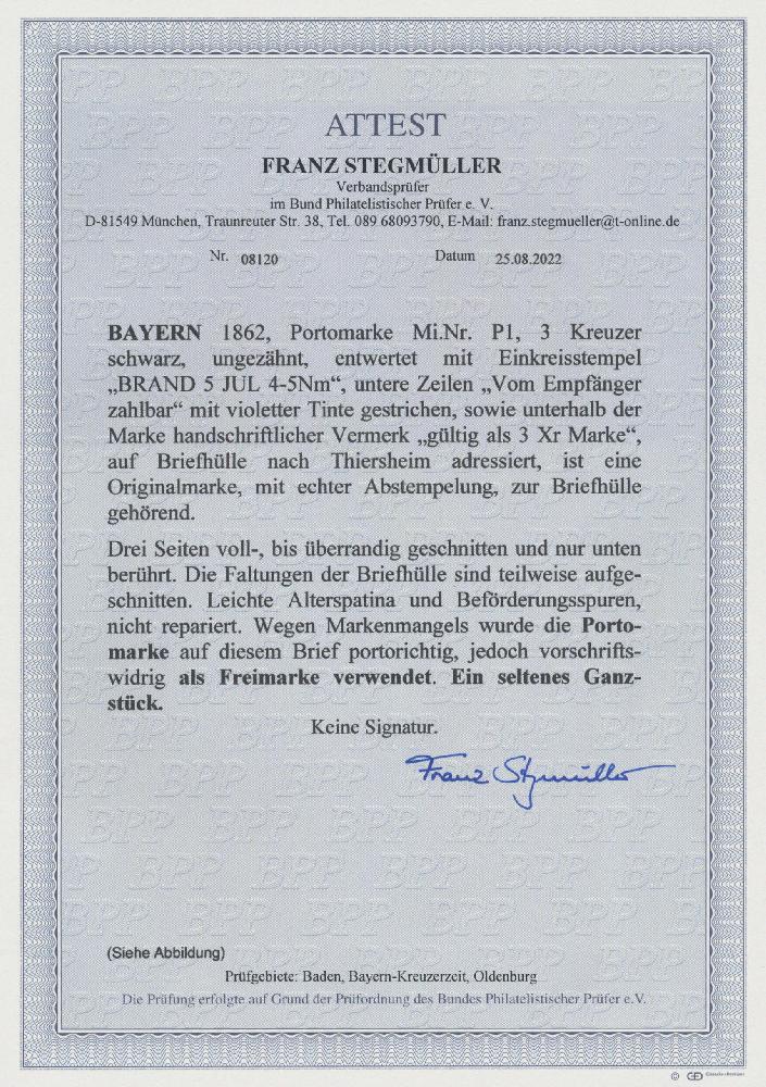 | Zusatzinformationen und Suchstichworte: | Christoph Gärtner 55. Auktion 20. - 24. Februar 2023 Los 5047 D Altdeutschland Bayern 1862, 3 Kreuzer schwarz geschnitten mit Seidenfaden und aufgesetztem K1 "BRAND 5 JUL." auf Briefhülle nach Thiersheim. Bei dieser Marke wurde postamtlich "Vom Empfänger zahlbar" durchgestrichen und mit violetter Tinte unter ihr vermerkt "Gültig alls 3 Kr. Marke". Die Marke ist dreiseitig voll- bis breitrandig geschnitten und nur unten berührt. Die Faltungen der Briefhülle sind teilweise aufgeschnitten mit leichter Alterspatina und Beförderungsspuren. Aufgrund eines vorübergehenden Mangels an 3-Kreuzer-Freimarken in diesem kleinen Ort bei Marktredwitz wurde die Portomarke zur normalen Frankatur verwendet (sogenanntes "BRAND-PROVISORIUM"), es handelt sich um einen der wenigen bekannten Briefen aus 4 verschiedenen bayrischen Orten, der heute noch in Privathand ist. Bayern war damit der erste Staat weltweit in dem Portomarken als Freimarken Verwendung fanden und setzte einen Meilenstein in der Geschichte der PM-Provisorien überhaupt. Am 27.6.1869 wurde diese Verwendungsart offiziell in Bayern per Amtsblatt-Verfügung unter Strafandrohung allgemein verboten, während sie in anderen Ländern zu späteren Zeitpunkten aus den unterschiedlichsten Anlässen immer wieder einmal praktiziert wurde. Laut neuestem Farbfotoattest Stegmüller/BPP, echt, nicht repariert und seltenes Ganzstück Ausruf 3.200,00 EUR |
