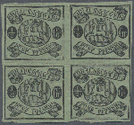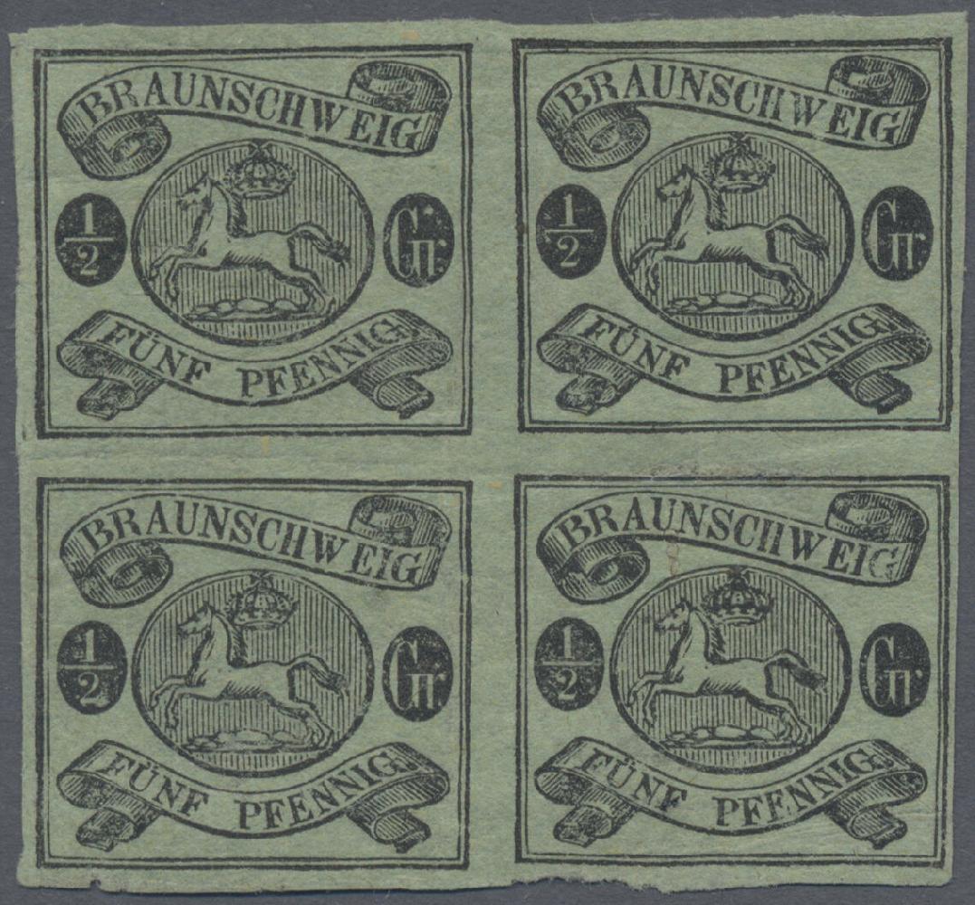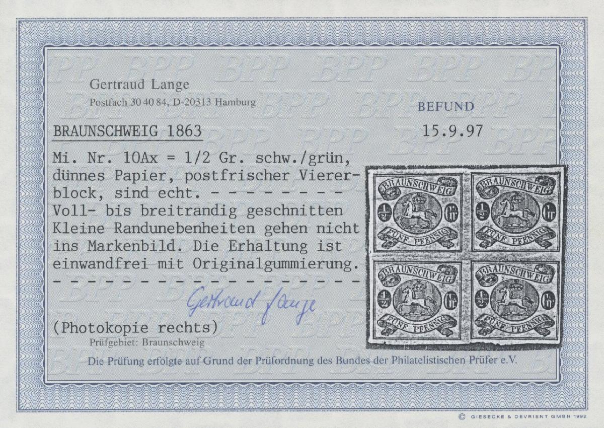 | Zusatzinformationen und Suchstichworte: | Christoph Gärtner 55. Auktion 20. - 24. Februar 2023 Los 5058 D Altdeutschland Braunschweig 1863, ½ Gr schwarz auf grün, dünner Papier, postfrischer Viererblock, ringsum tadellos voll- bis breitrandig, unten teils gerissen, mit Originalgummirung ohne jegliches Signum, Befund Lange BPP Ausruf 120,00 EUR |
