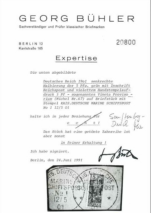 | Zusatzinformationen und Suchstichworte: | Dr. Reinhard Fischer 190. Auktion 27. - 28. Januar 2023 Los 36 Deutsches Reich 3 Pf. auf 5 Pfg Germania, Halbierung - linke Hälfte, sog. Vineta-Provisorium, vorliegendes Stück ist ein sog. Sanftenberg-Nachdruck, entwertet mit rückdatiertem Stempel "Kais. Deutsche Marineschiffspost No. 1 12/5 01" auf Unterlage, tadellose Erhaltung, Fotoattest Georg Bühler (1991) als Original und aktueller Befund Dr. Christian Mozek (2022): "einwandfrei .... Früher wurden diese Stücke als Fälschungen bezeichnet, sie besitzen jedoch ein gewisses philatelistisches Interesse und sind auch relativ selten.", Anzumerken sei, dass Herr Dr. Mozek das Attest von Herrn Bühler entsprechend mit "Sanftenberg-Druck" und seinem Kürzel markiert hat Zuschlag 1.300,00 EUR |