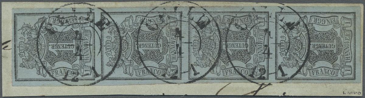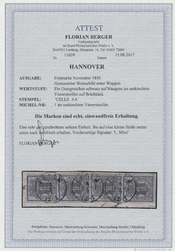 | Zusatzinformationen und Suchstichworte: | Christoph Gärtner 55. Auktion 20. - 24. Februar 2023 Los 5076 D Altdeutschland Hannover 1850, Wertschild unter Wappen, 1 Ggr. schwarz auf blaugrau, senkrechter Viererstreifen, allseits vollrandig und einwandfrei, bis auf eine kleine Stelle rechts unten auch sehr farbfrisch mit Zweikreisstempel "Celle / 4 4" auf Briefstück, nach Fotoattest Berger BPP (2017) "eine sehr gut geschnittene, seltene Einheit". Außerdem geprüft Leon Miro (Paris) Ausruf 2.500,00 EUR |