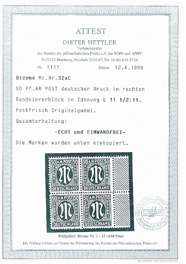 | Zusatzinformationen und Suchstichworte: | Dr. Reinhard Fischer 193. Auktion 21. - 22. Juli 2023 Los 6691 Bizone 50 Pfg AM-Post, deutscher Druck, C-Zähnung, tadellos postfrisch, Attestkopie Hettler BPP (für Einheit): "echt und einwandfrei", Mi. 200.- Ausruf 40,00 EUR |