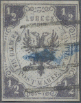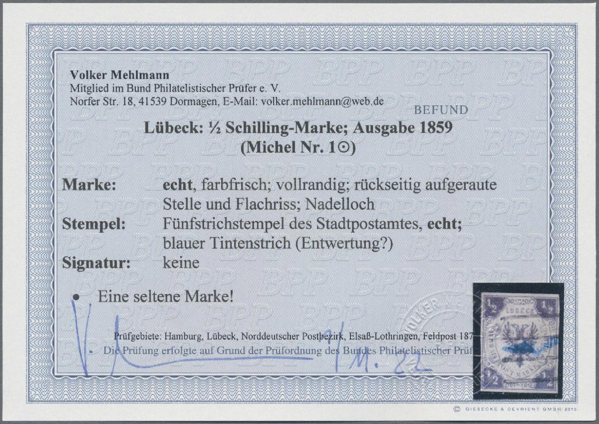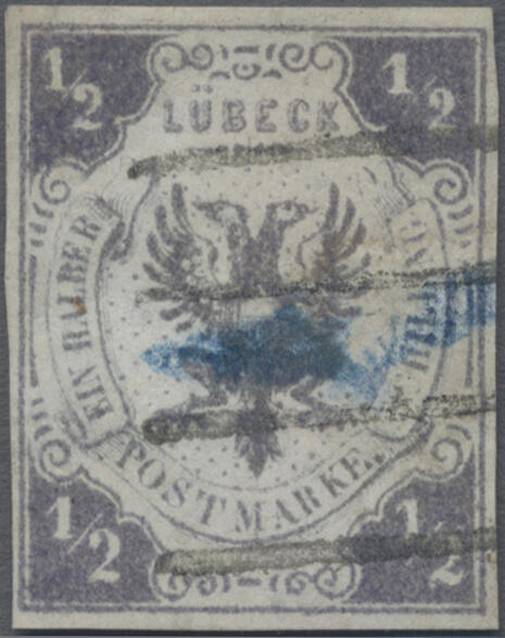 | Zusatzinformationen und Suchstichworte: | Christoph Gärtner 55. Auktion 20. - 24. Februar 2023 Los 5086 D Altdeutschland Lübeck 1859, Freimarke Wappen ½ S dunkelviolettgrau, entwertet mit Fünfstrichstempel des Stadtpostamtes. Die Marke ist farbfrisch, vollrandig, rückseitig mit aufgerauter Stelle, Flachriss und Nadelloch, dazu blauer Tintenstrich (Entwertung). Eine seltene Marke. Fotobefund Mehlmann BPP (Mi€2.500,-) Zuschlag 380,00 EUR |