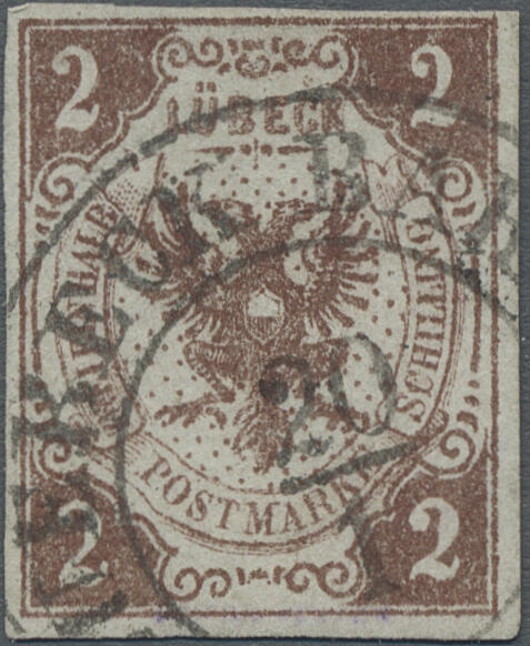 | Zusatzinformationen und Suchstichworte: | Christoph Gärtner 55. Auktion 20. - 24. Februar 2023 Los 5088 D Altdeutschland Lübeck 1859, Doppeladler, Fehldruck 2 Schilling mit Schriftband "ZWEI EIN HALB" rötlichbraun, klar entwertet mit Ortsstempel "Luebeck Bah[nhof], allseitig voll- bis breitrandig geschnitten in farbfrischer Luxus-Erhaltung. Mehrfach signiert bzw. geprüft von den großen Händlern der Vorkriegszeit "Friedl" (hs.), "Philipp Kosack", "M. Kurt Maier / Berlin" und mit Fotoattest Brettl BPP (1994), die bestätigt: "eine sehr seltene Marke. Mit Ortsstempel nur in den ersten zwei Monaten vorkommend", vielleicht das schönste gestempelte Exemplar dieses Fehldrucks Zuschlag 7.500,00 EUR |
