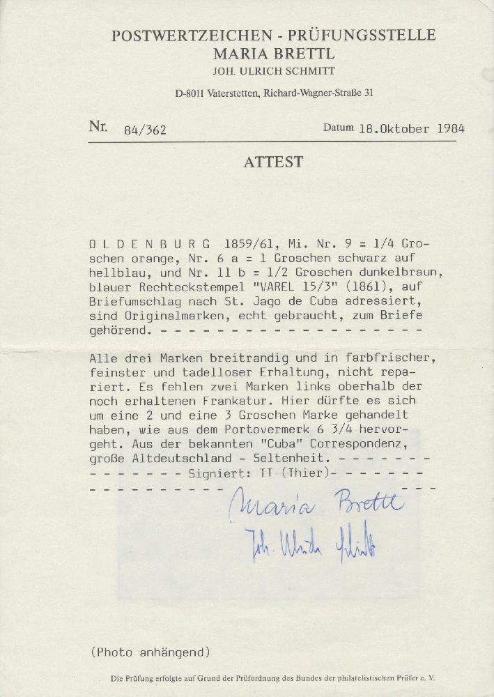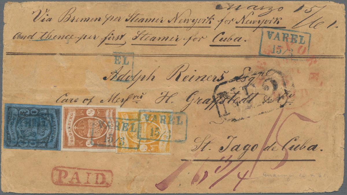 | Zusatzinformationen und Suchstichworte: | Christoph Gärtner 55. Auktion 20. - 24. Februar 2023 Los 5100 D Altdeutschland Oldenburg 1861, 1 Gr. schwarz auf hellblau, 1/4 Gr. gelblichorange und 1/2 Gr. dunkelbraun, alle Marken farbfrisch, breitrandig und in tadelloser Qualität auf bräunlichem Briefcouvert (1861), blauer Ra 2 VAREL nach St. Jago de Cuba. Es fehlen zwei Marken links oberhalb der noch erhaltenen Frankatur. Hier dürfte es sich um eine 2 Gr. bzw. 3 Gr. Marke gehandelt haben, wie aus dem Postvermerk "6 3/4" hervorgeht. Aus der bekannten "Reiners/Cuba" Korrespondenz. Eine ganz große Seltenheit, sign. Thier sowie Foto-Attest Brettl/Schmitt (1984) Ausruf 2.000,00 EUR |