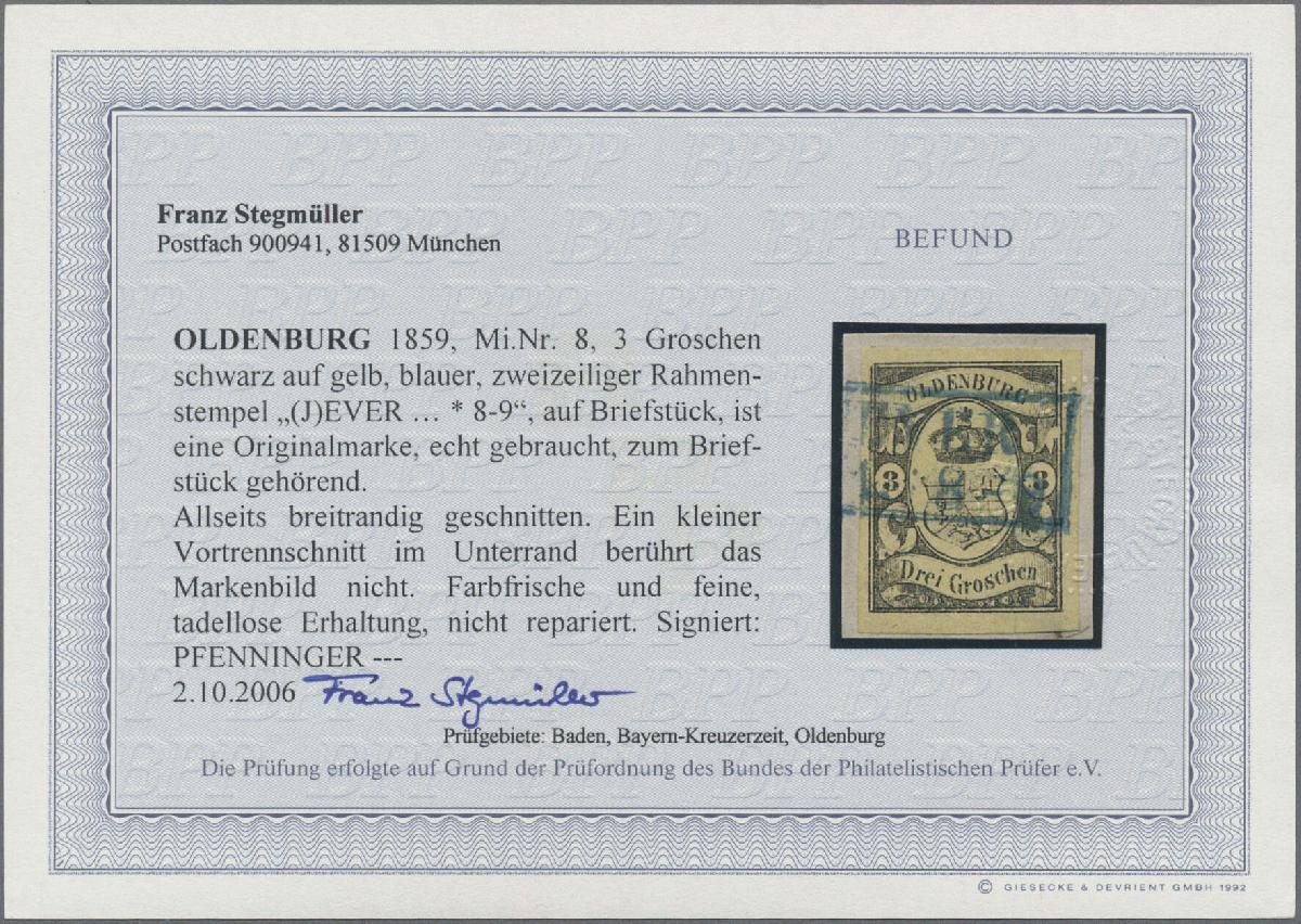 | Zusatzinformationen und Suchstichworte: | Christoph Gärtner 55. Auktion 20. - 24. Februar 2023 Los 5103 D Altdeutschland Oldenburg 1859, 3 Gr. schwarz auf mittelgraugelb, farbfrisch, blauer Ra 2 JEVER, sign. Pfenninger sowie Foto-Befund Stegmüller (2006), Mi 750,- Ausruf 150,00 EUR |