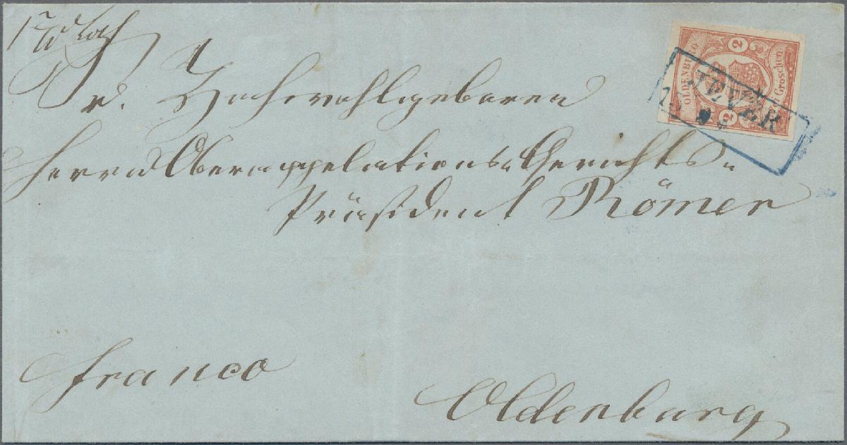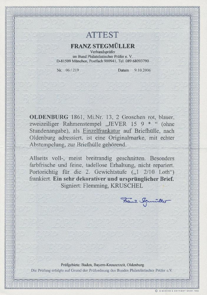 | Zusatzinformationen und Suchstichworte: | Christoph Gärtner 55. Auktion 20. - 24. Februar 2023 Los 5115 D Altdeutschland Oldenburg 1861, 2 Gr. dunkelzinnober, farbfrisch, allseits voll-, meist breitrandig, als Einzelfrankatur auf Briefhülle, blauer Ra 2 JEVER (ohne Stundenangabe) nach Oldenburg, sign. Flemming, Kruschel sowie Foto-Attest Stegmüller (2006): "Ein sehr dekorativer und ursprünglicher Brief", Mi 2200,- Ausruf 500,00 EUR |