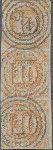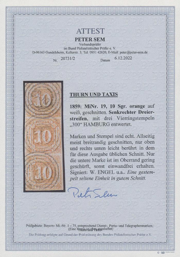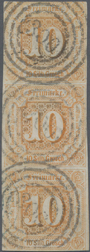 | Zusatzinformationen und Suchstichworte: | Christoph Gärtner 55. Auktion 20. - 24. Februar 2023 Los 5169 D+ Altdeutschland Thurn und Taxis 1859, Freimarken: Ziffern im Quadrat 10 Sgr. orange auf weiß, geschnitten. Senkrechter Dreierstreifen, mit drei Vierringstempeln "300" HAMBURG entwertet. Allseitig meist breitrandig geschnitten, nur oben und rechts leicht berührt in dem für die Ausgabe üblichen Schnitt. Nur die untere Marke ist im Oberrand gering geschürft, sonst einwandfrei erhalten. Eine gestempelt seltene Einheit in gutem Schnitt, Fotoattest Sem BPP (Mi€3.200,-) Ausruf 600,00 EUR |