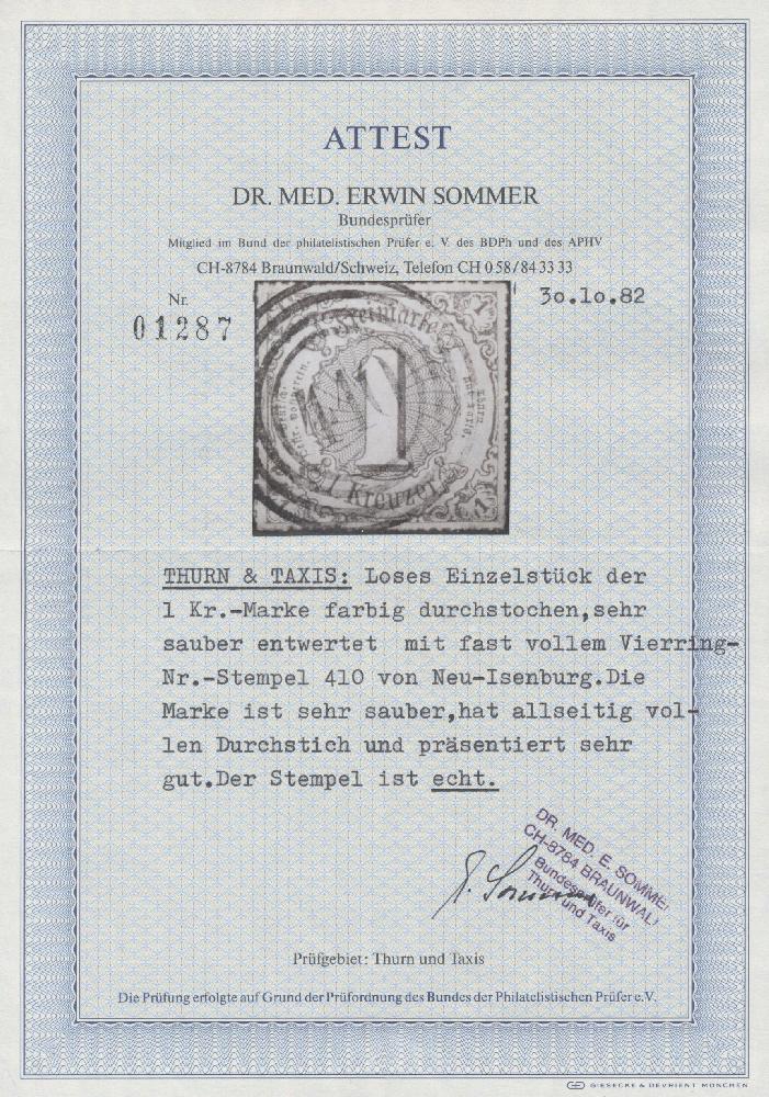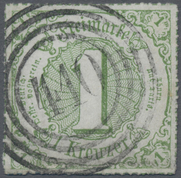 | Zusatzinformationen und Suchstichworte: | Christoph Gärtner 55. Auktion 20. - 24. Februar 2023 Los 5191 D Altdeutschland Thurn und Taxis 410 - Neu-Isenburg, klarer Abschlag auf 1 Kr. grün (MiNr. 51), farbfrisch mit allseits gutem Durchstich (nur links unten kl. Unebenheit, belanglos). Fotoattest Sommer BPP Ausruf 100,00 EUR |