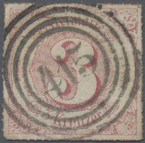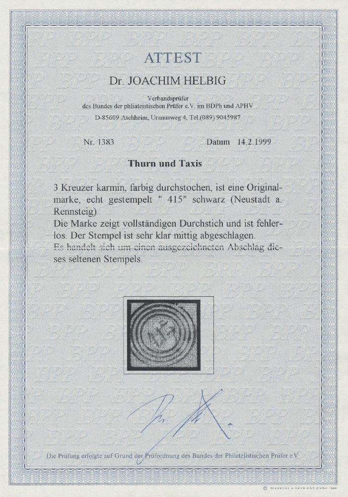 | Zusatzinformationen und Suchstichworte: | Christoph Gärtner 55. Auktion 20. - 24. Februar 2023 Los 5193 D Altdeutschland Thurn und Taxis 415 - Neustadt am Rennsteig, klarer Abschlag auf 3 Kr. karmin (MiNr. 52), farbfrisch und allseits vollständiger Durchstich. Fotoattest Dr. Helbig BPP Ausruf 100,00 EUR |