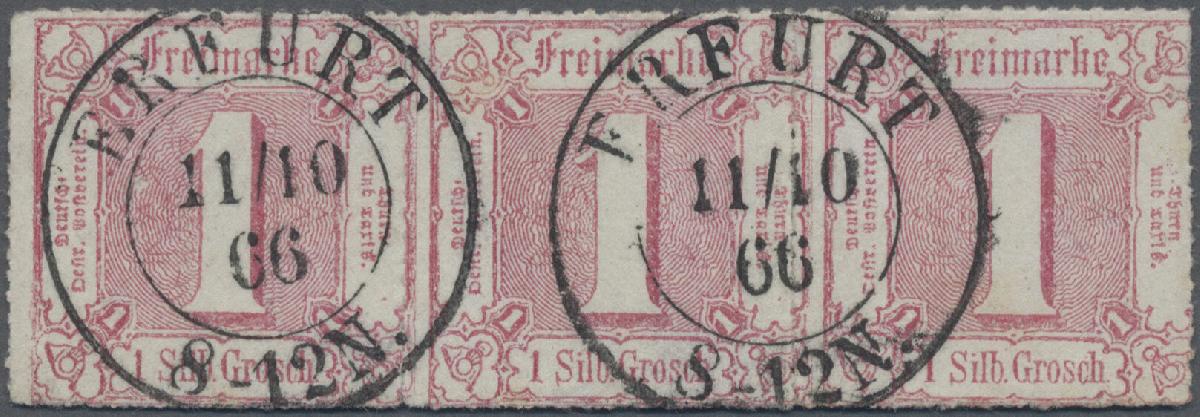| Zusatzinformationen und Suchstichworte: | Christoph Gärtner 55. Auktion 20. - 24. Februar 2023 Los 5197 D Altdeutschland Preussen 1866, ERFURT, 11/10 66, zwei klare und zentrische preussische Zweikreisstempel als FREMDENTWERTUNG auf waagerechtem Dreierstreifen der 1 Sgr karminrot mit allseits vollständigem Durchstich, leicht gereinigt, sonst völlig einwandfrei und insgesamt attraktive Erhaltung. Signiert HK und Fotoattest Sem Ausruf 150,00 EUR |