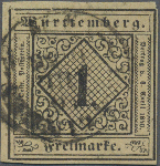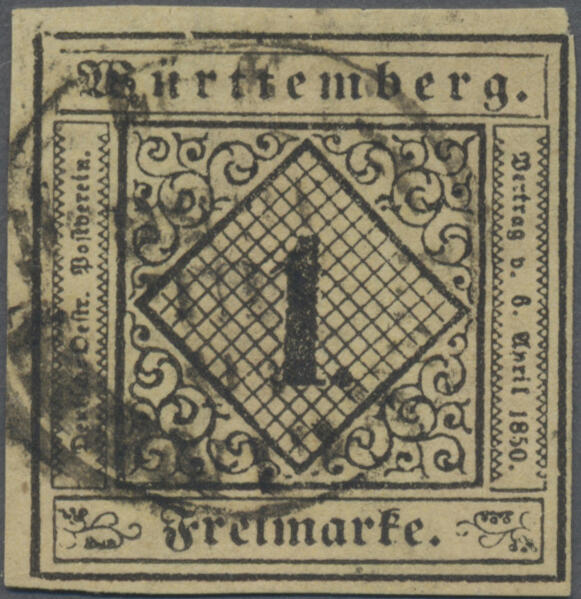 | Zusatzinformationen und Suchstichworte: | Christoph Gärtner 55. Auktion 20. - 24. Februar 2023 Los 5208 D Altdeutschland Württemberg 1851, 1 Kr. schwarz auf altelfenbein mit Arge-Plattenfehler IV, farbfrisch und allseits voll- bis breitrandig, sauber gestempelt mit Kr. "ESSLINGEN 16 JUL 1855", Fotoattest Heinrich BPP "einwandfrei" (Arge 800,-) Ausruf 300,00 EUR |