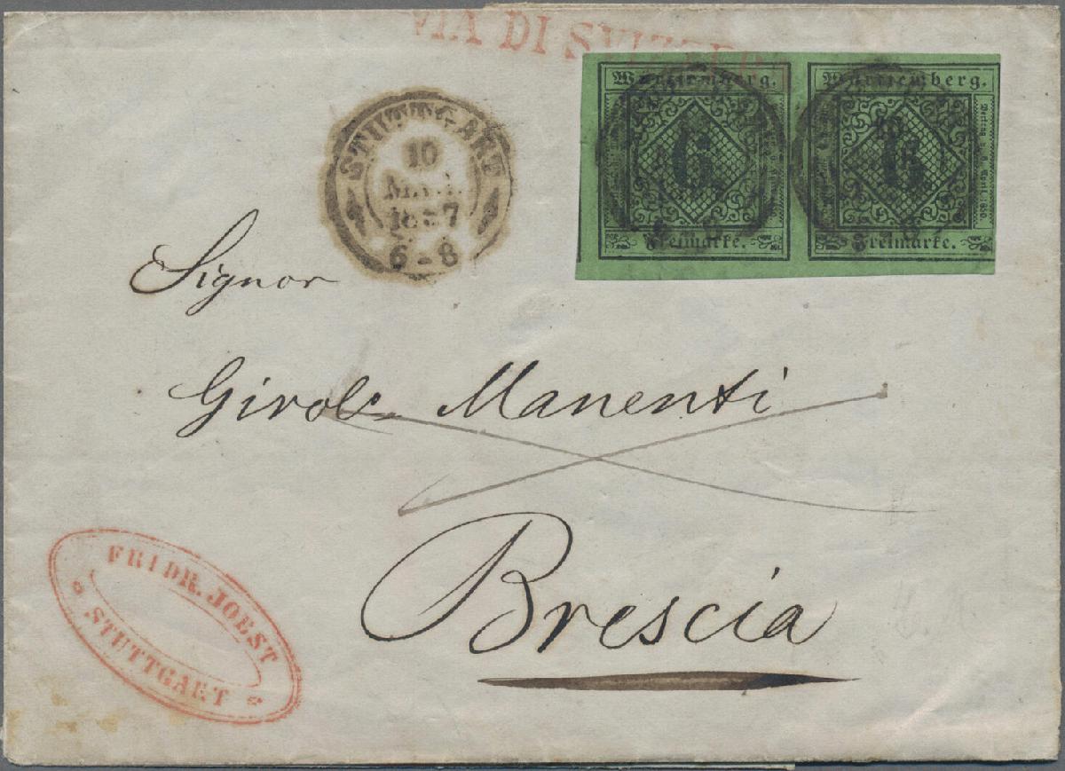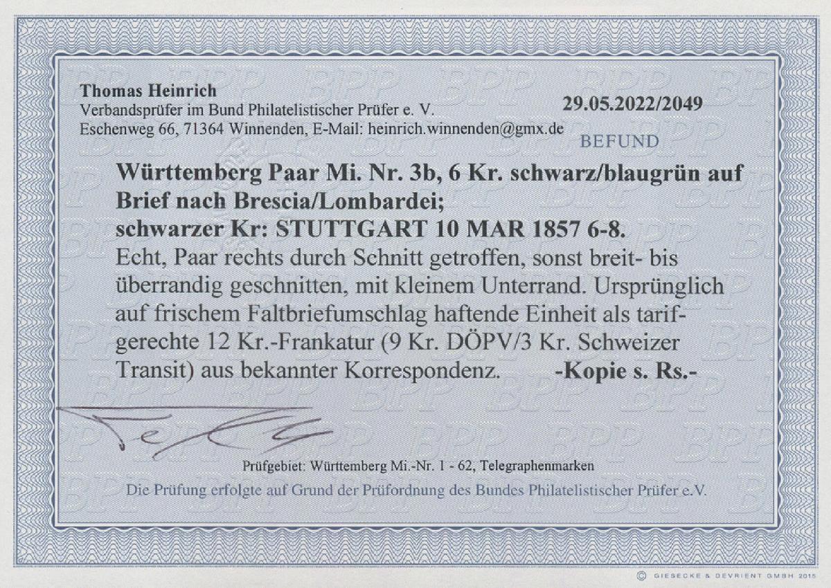 | Zusatzinformationen und Suchstichworte: | Christoph Gärtner 55. Auktion 20. - 24. Februar 2023 Los 5221 D Altdeutschland Württemberg 1857, 6 Kr. schwarz auf blaugrün, farbfrisches waagerechtes Paar, rechts angeschnitten, sonst breit- bis überrandig mit kleinem Unterrand und Teilen der linken Nachbarmarke als tarifgerechte Frankatur auf Faltbrief von "STUTTGART 10 MAI 1857" nach Brescia mit rs. Ankunftsstempel. Fotobefund Heinrich BPP Ausruf 350,00 EUR |