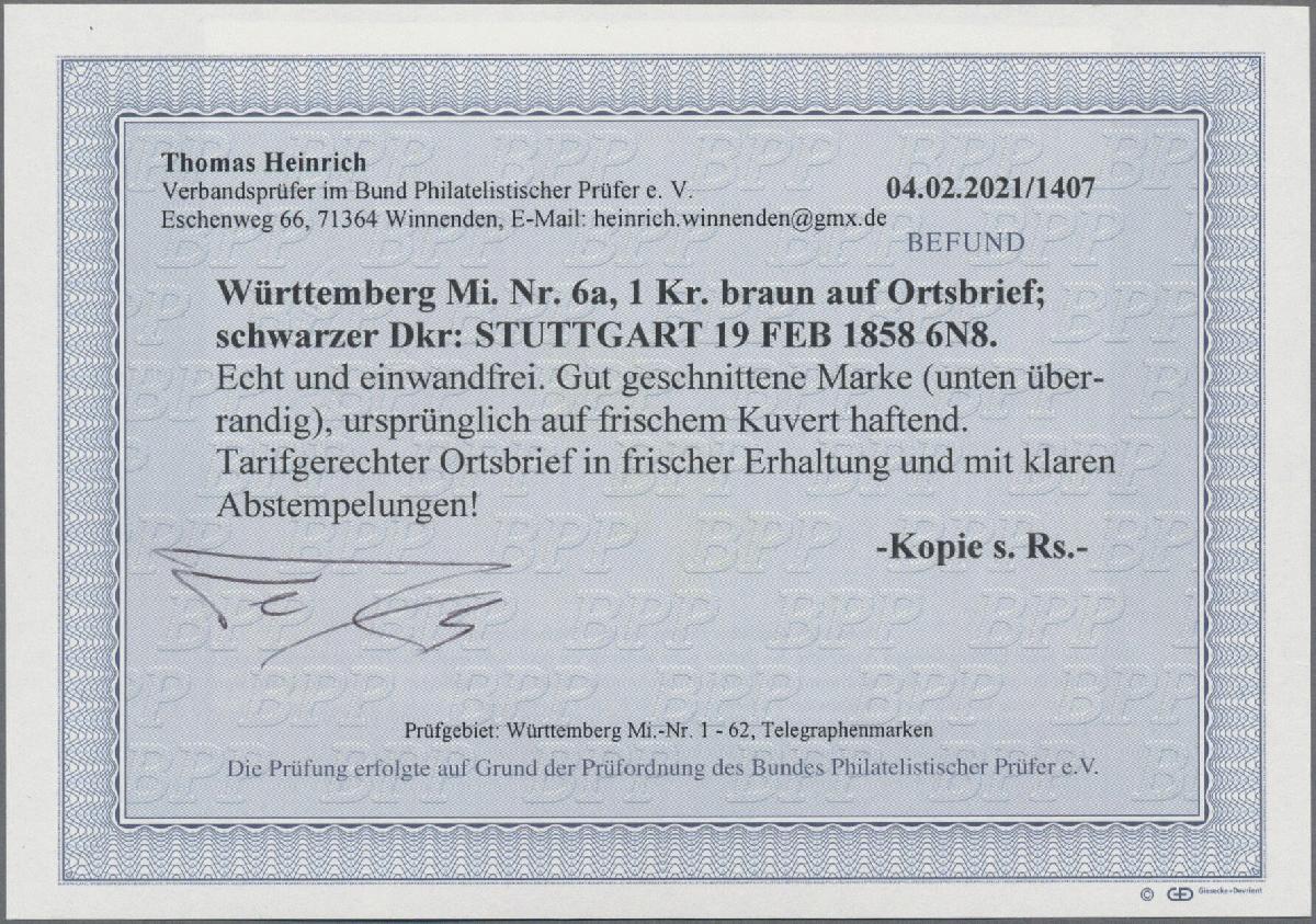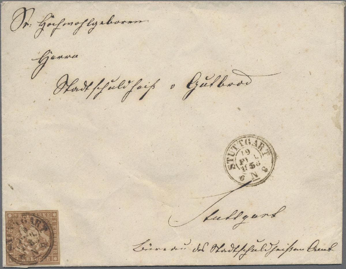 | Zusatzinformationen und Suchstichworte: | Christoph Gärtner 55. Auktion 20. - 24. Februar 2023 Los 5224 D Altdeutschland Württemberg 1858, 1 Kr. braun, farbfrischer Wert in allseits gutem Schnitt, unten überrandig, als tarifgerechte Einzelfrankatur auf Ortsbrief von "STUTTGART 19 FEB 1858" an den Stadtschultheiß von Gutbrod. Fotobefund Heinrich BPP Ausruf 150,00 EUR |