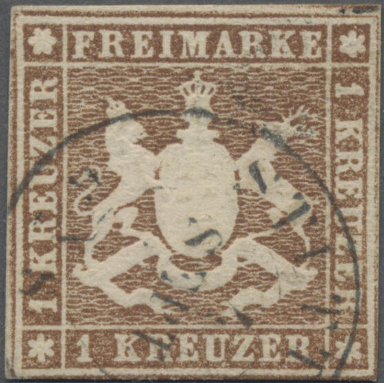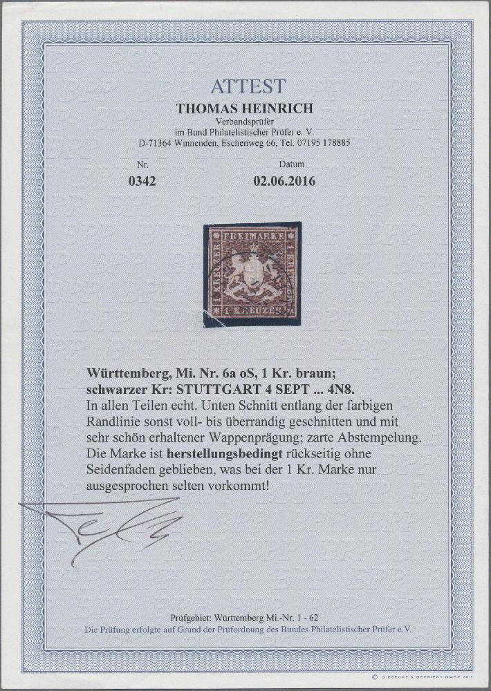 | Zusatzinformationen und Suchstichworte: | Christoph Gärtner 55. Auktion 20. - 24. Februar 2023 Los 5225 D Altdeutschland Württemberg 1857, 1 Kr. braun mit Abart "ohne Seidenfaden", farbtiefes und allseits gut gerandetes Exemplar mit üblichem, leicht berührendem Schnitt, sauber gestempelt mit Kr. "STUTTGART". Fotoattest Heinrich BPP "...was bei der 1 Kr. Marke nur ausgesprochen selten vorkommt" Ausruf 800,00 EUR |