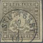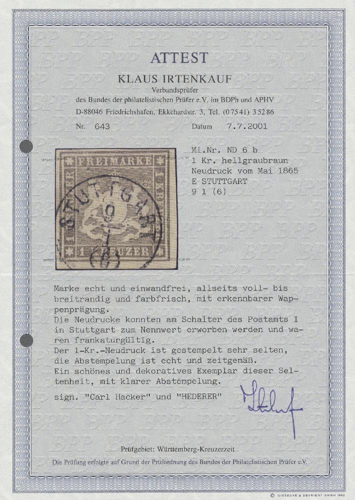 | Zusatzinformationen und Suchstichworte: | Christoph Gärtner 55. Auktion 20. - 24. Februar 2023 Los 5227 D Altdeutschland Württemberg 1865, Wappen geschnitten, 1 Kr. hellgraubraun mit bayrischem Seidenfaden als amtlicher NEUDRUCK. Diese konnten zum Nennwert in Stuttgart beim Postamt 1 erworben werden und waren frankaturgültig. Der Neudruck ist gestempelt sehr selten, hier zudem in tadelloser Erhaltung mit klarer Abstempelung. Entsprechend Attest Irtenkauf BPP (2016), außerdem geprüft Carl Hacker und Hederer Ausruf 850,00 EUR |